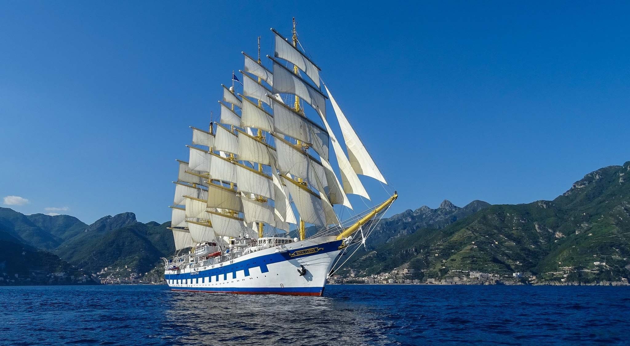 Description: A large white and blue ship sailing on a body of water near mountains and a town in the distance.