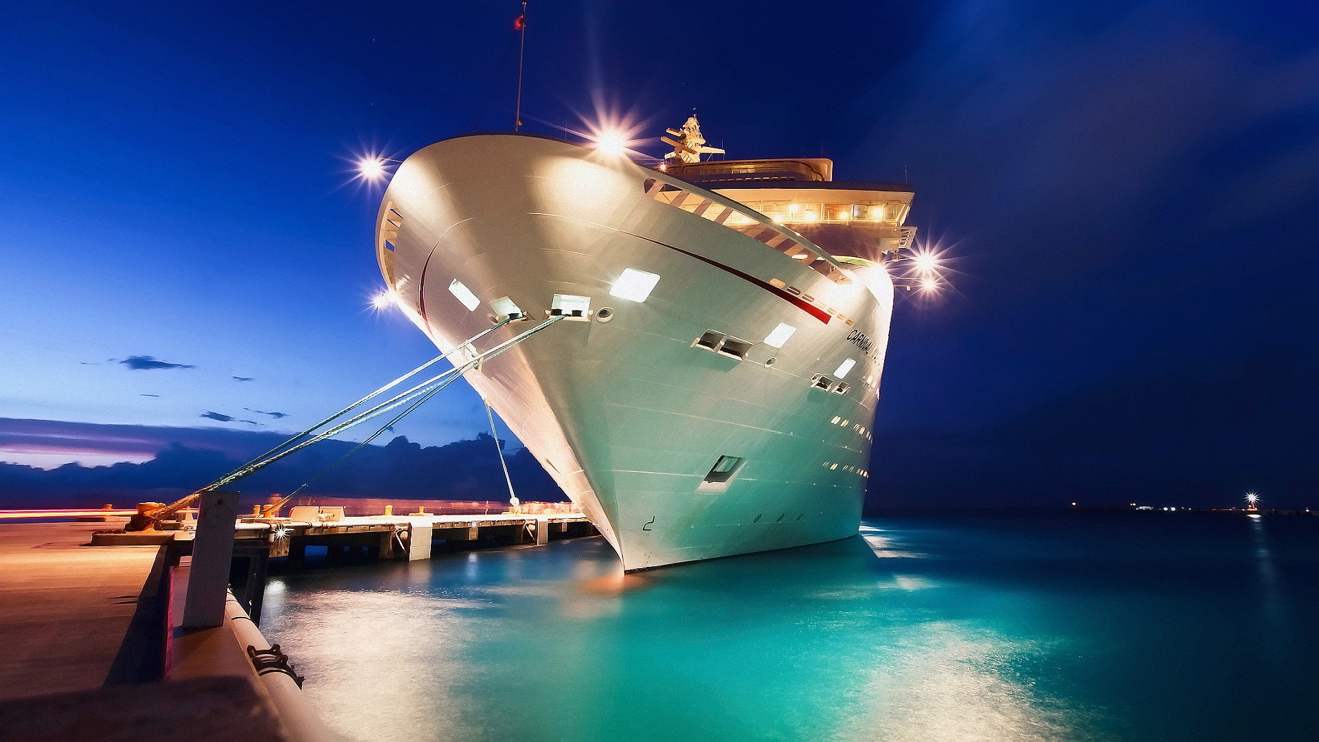 Description: A large white boat docked at a pier at night time with lights on it's side and a pier in the foreground.
