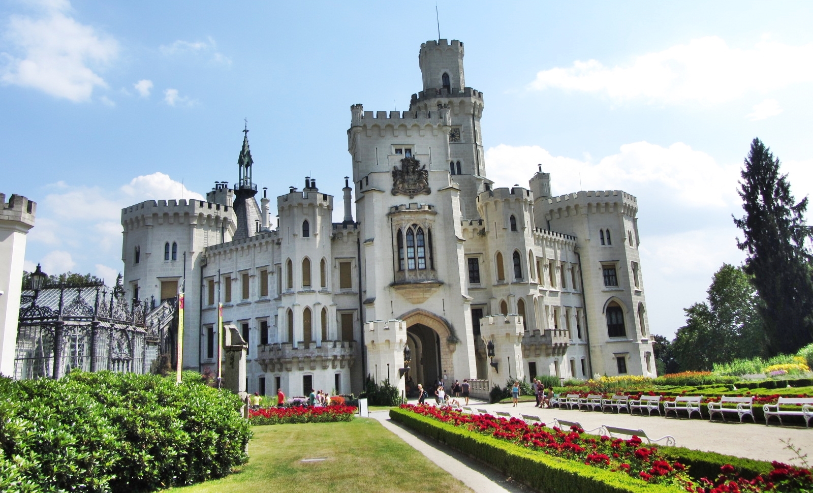 Description: A large white castle with a clock tower on top of it's side walk and a garden in front of it.