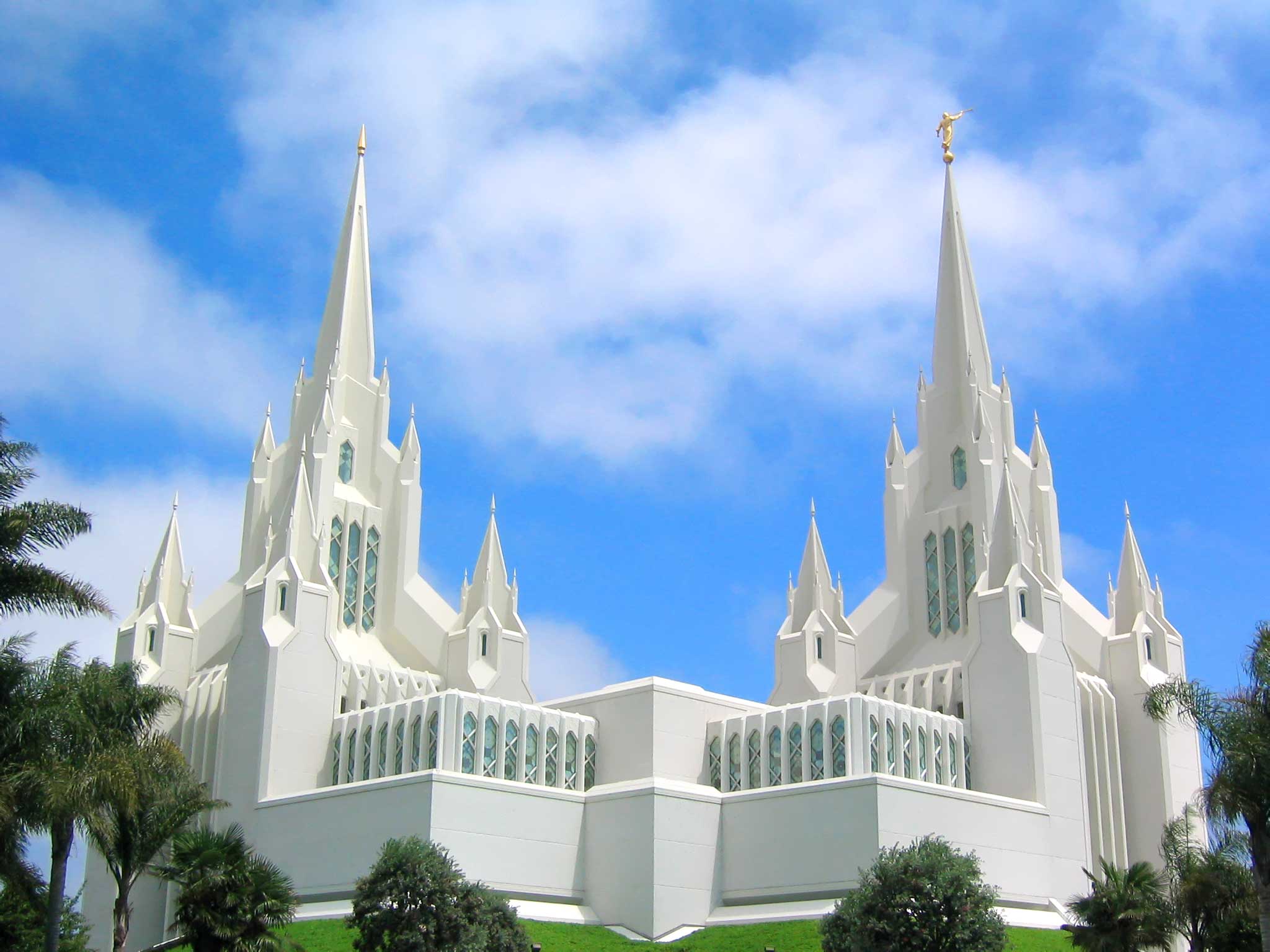 Description: A large white church with a green lawn and trees in front of it and a blue sky with clouds.