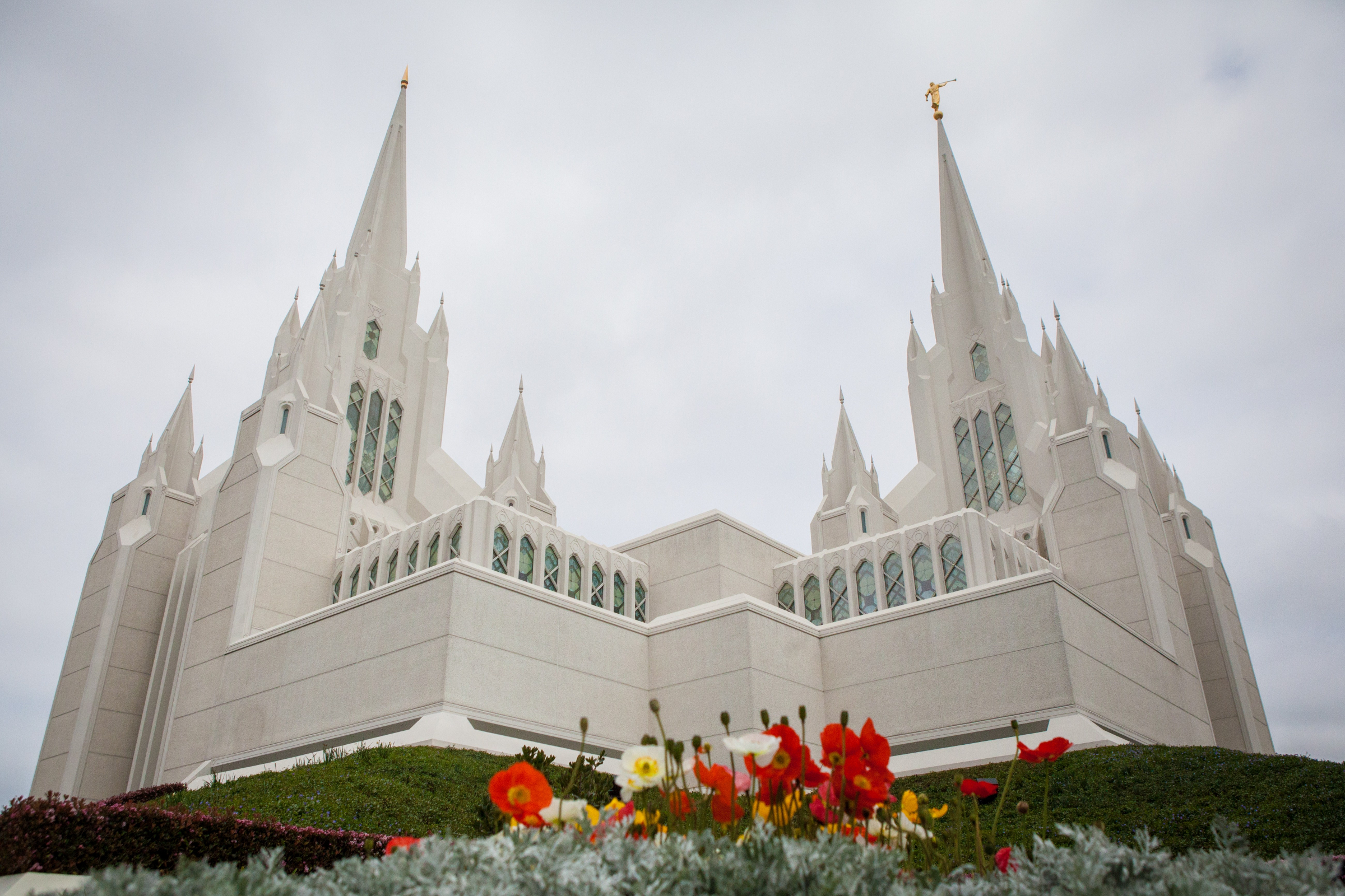Description: A large white church with a steeple and flowers in front of it on a cloudy day with a sky background.
