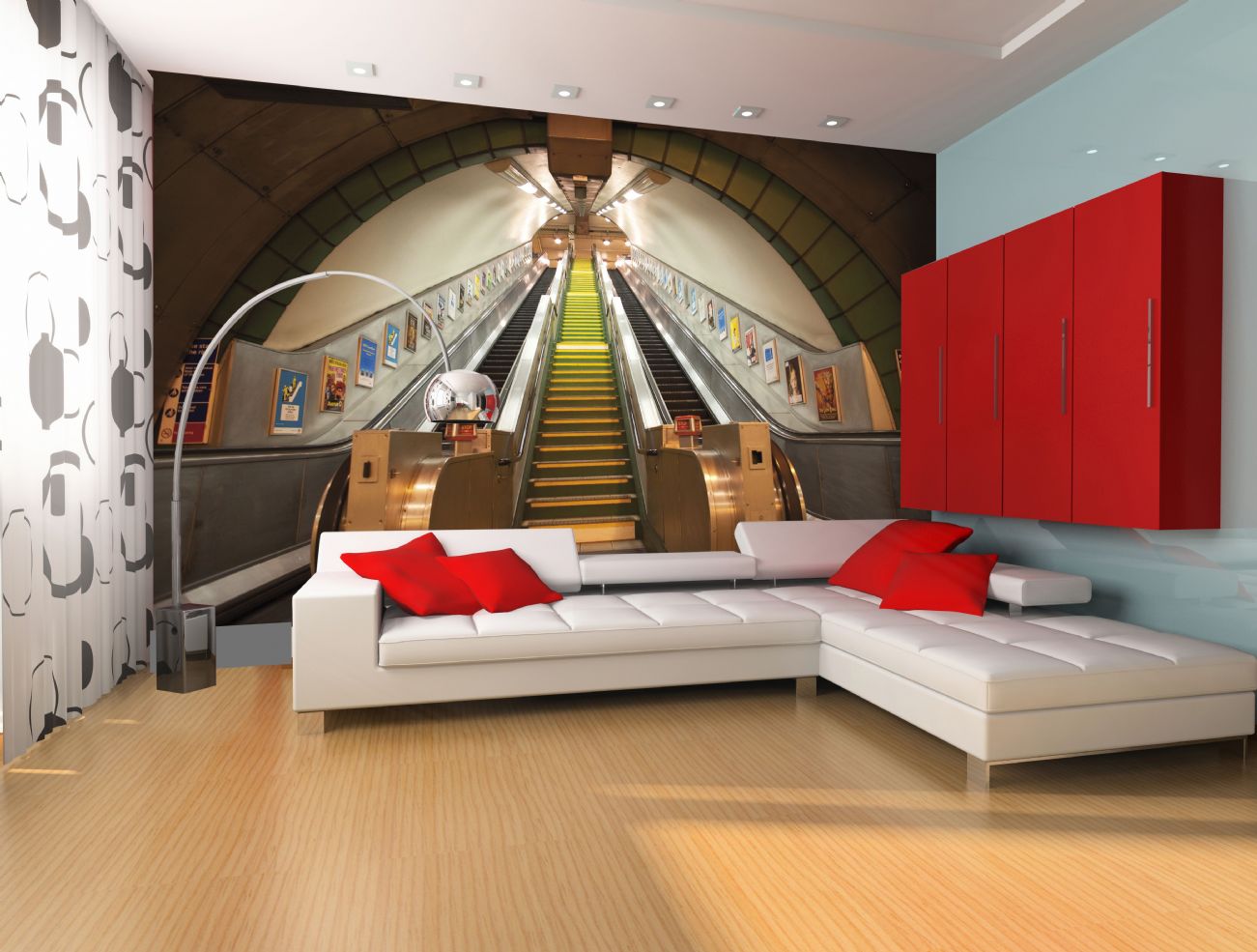Description: A large white couch sitting in a living room under a painting on the wall of a subway station with a staircase.