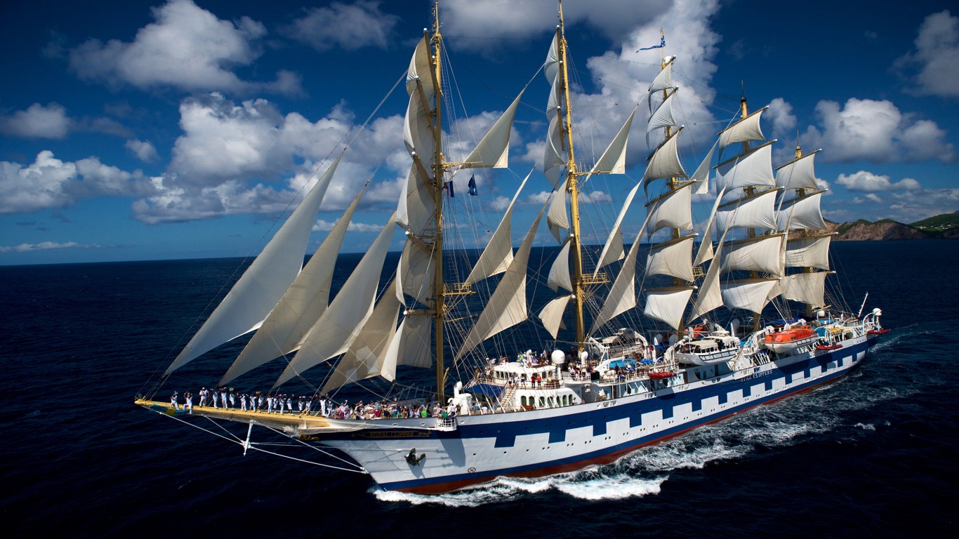 Description: A large white sail boat with sails full of people on the water and clouds in the sky above it.