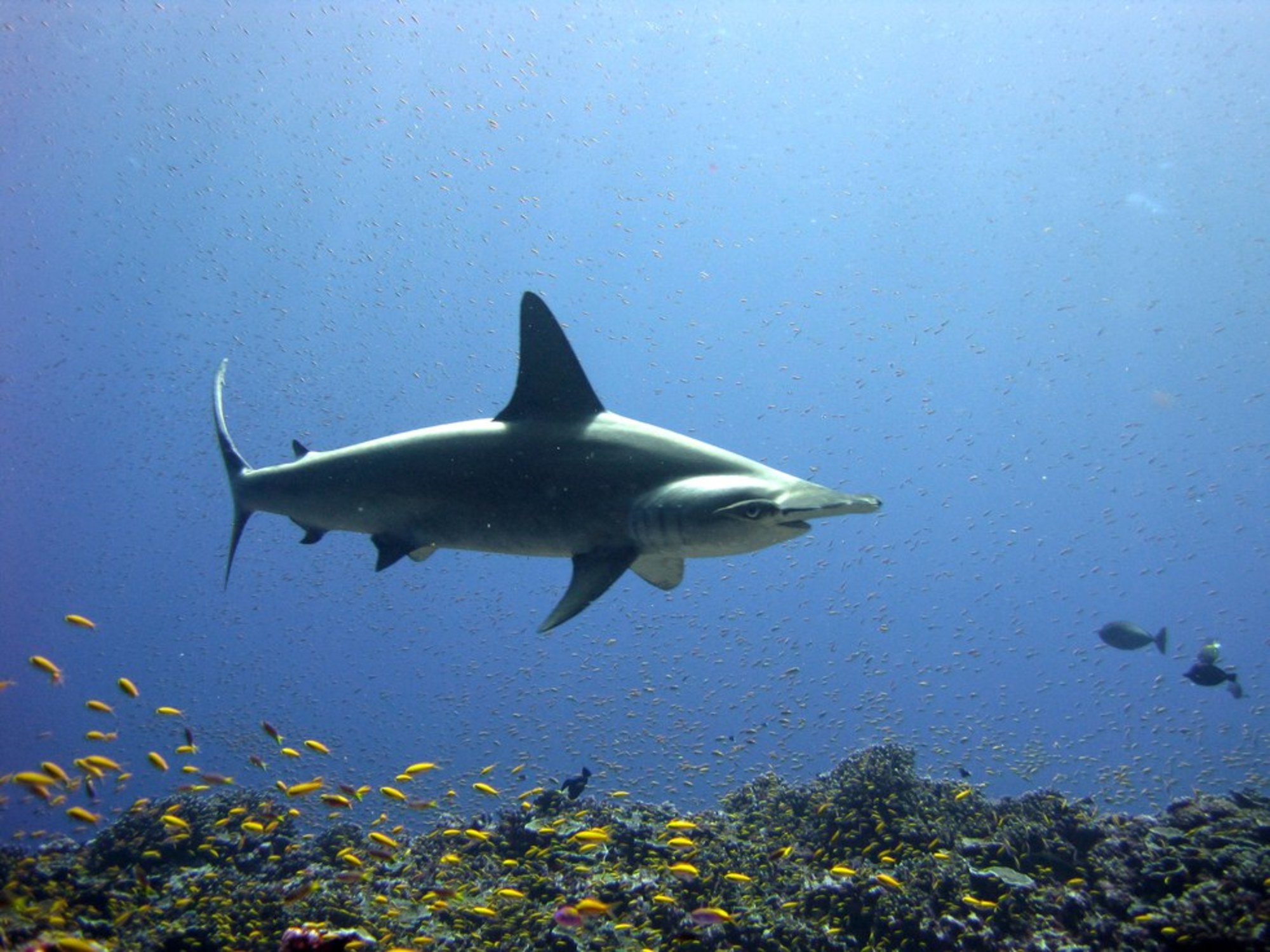 Description: A large white shark swimming in the ocean with a lot of fish around it's neck and head.