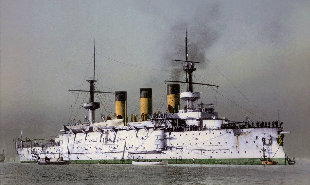 Description: A large white ship with smoke coming out of it's stacks and smoke stacks on the side of it.