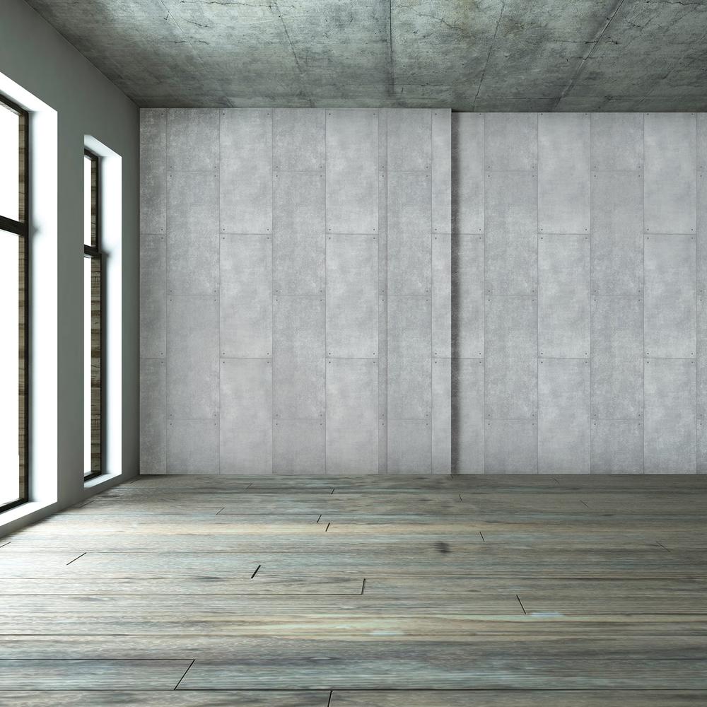 Description: A room with a large window and a wooden floor with a concrete wall and floor tiles on the floor.