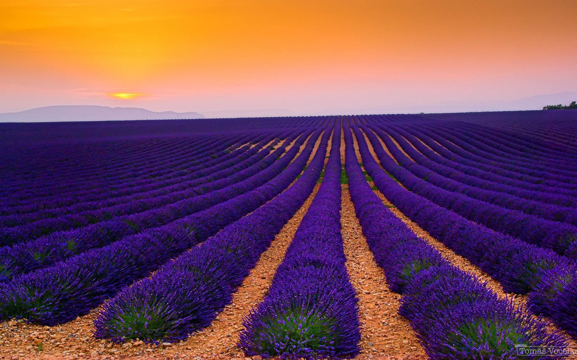 Description: A field of lavender flowers with the sun setting in the background and a pink sky in the distance with a few clouds.