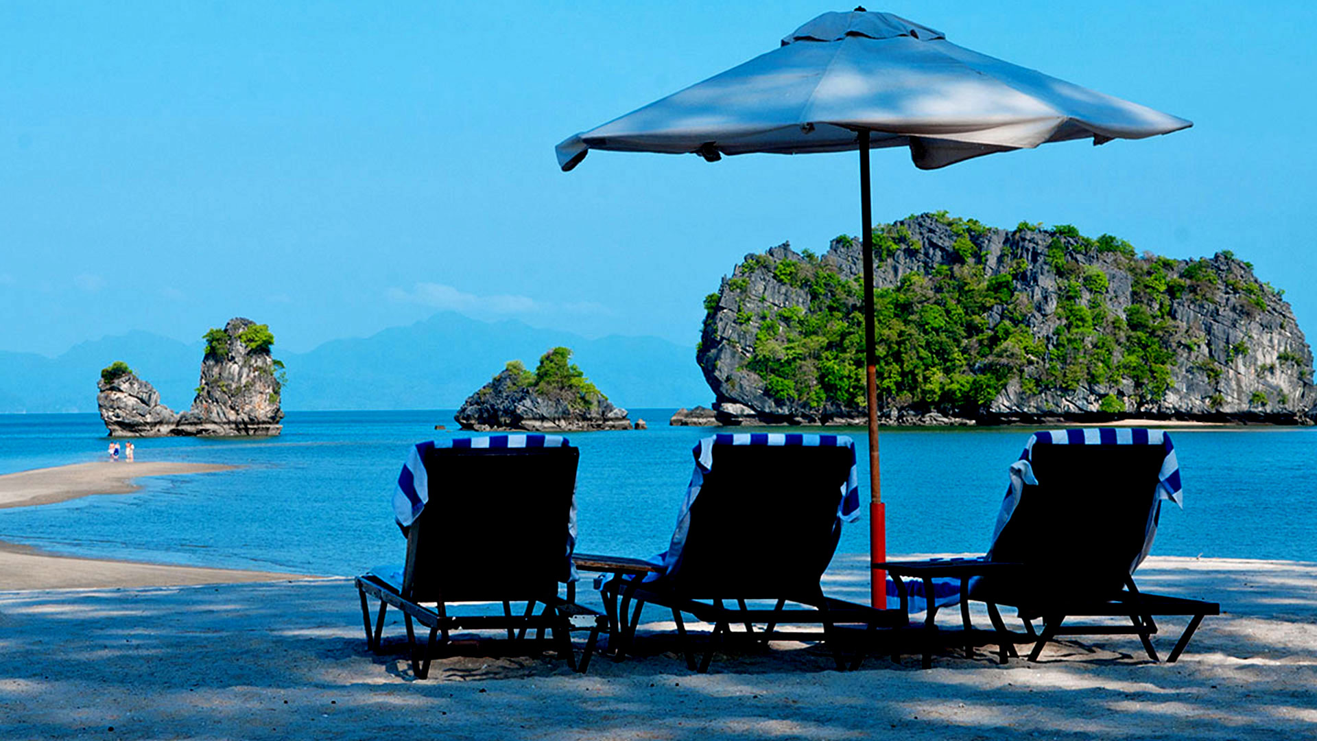 Description: A couple of lawn chairs sitting under an umbrella on a beach near the ocean with an island in the background.