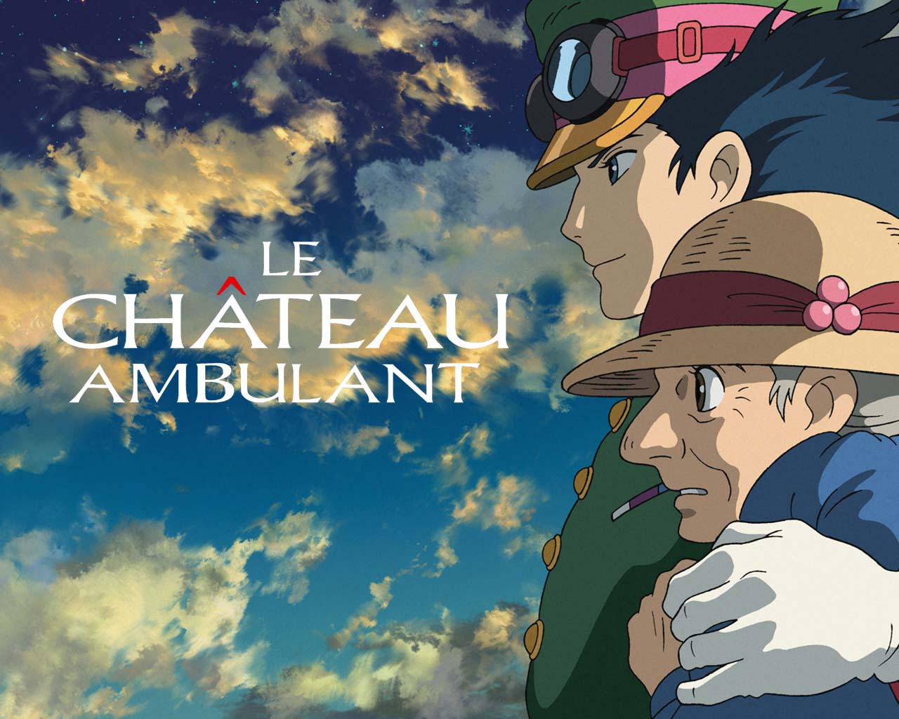 Description: A group of people standing next to each other under a cloudy sky with the words le chateau ambulant.