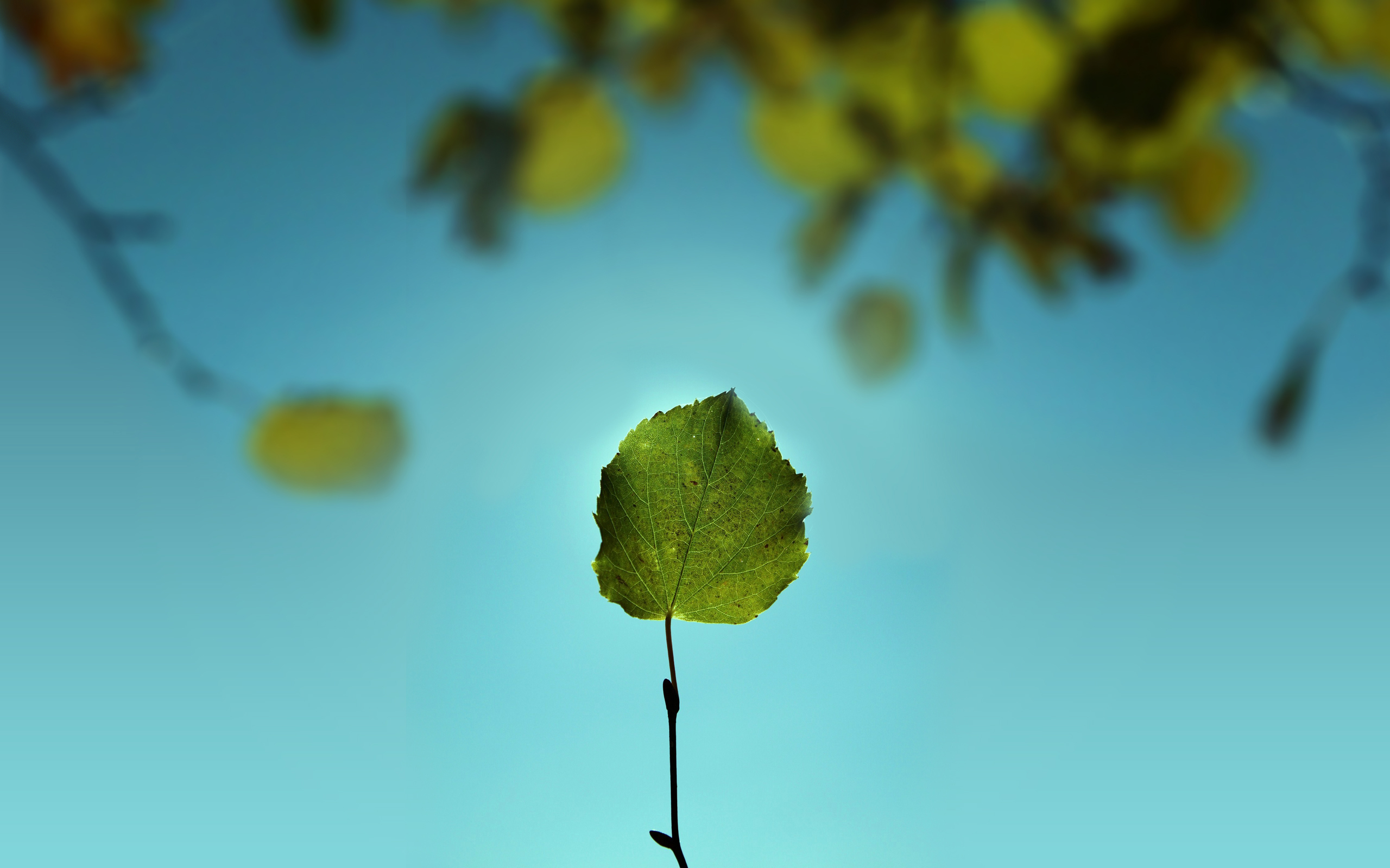 Description: A single leaf is shown against a blue sky background with a few leaves on it.