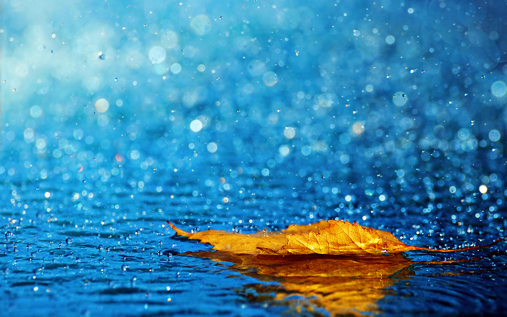 Description: A leaf floating on a blue surface with water droplets on it and a blue sky background with a few white dots.