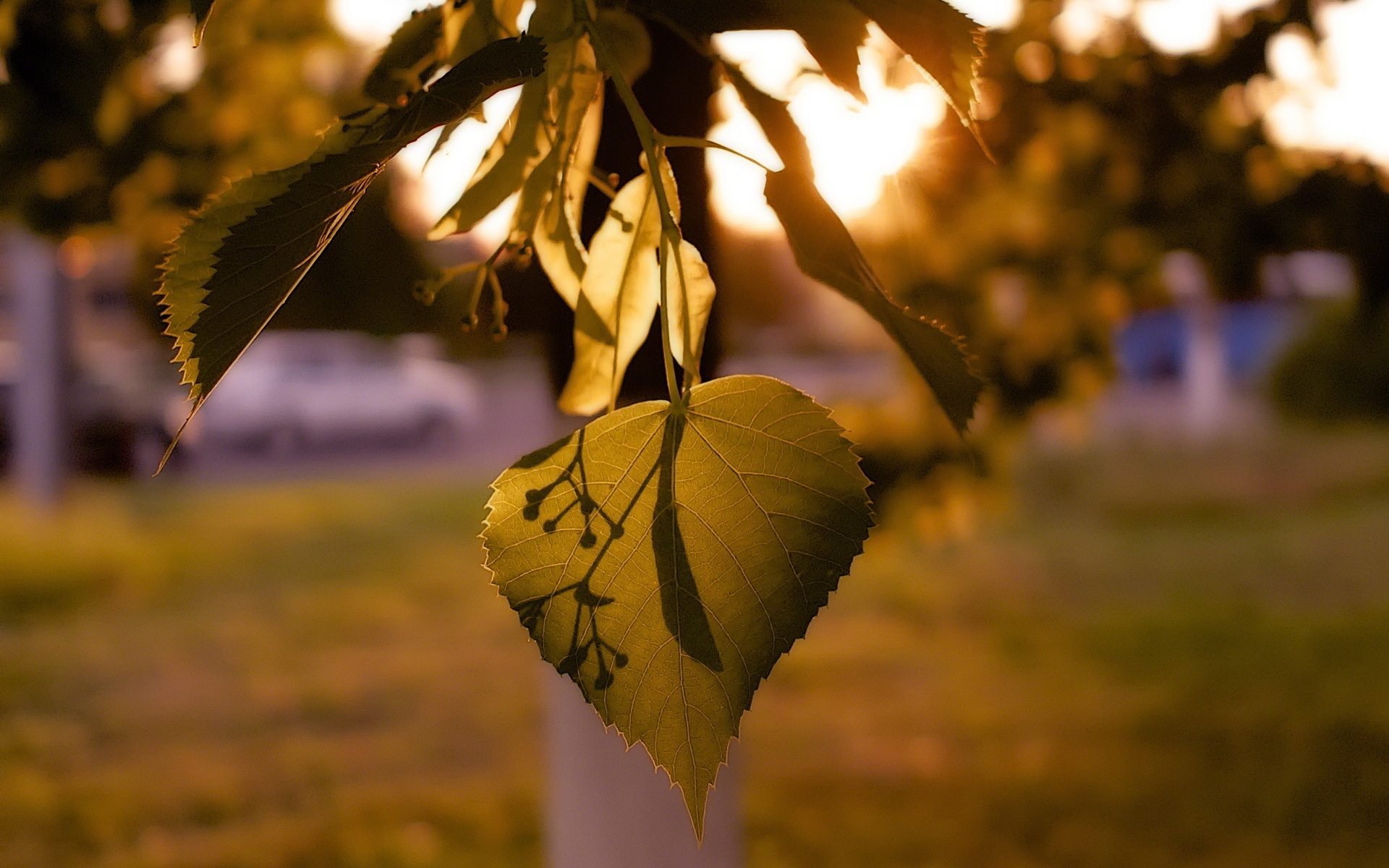 Description: A leaf hanging from a tree branch in a park at sunset or sunrise time.