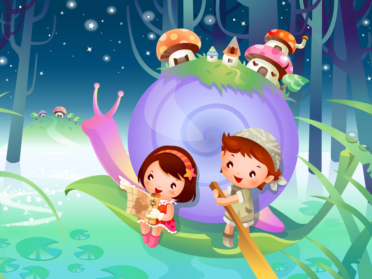 Description: A cartoon of a boy and a girl on a leaf with a mushroom house in the background and a blue sky with stars.