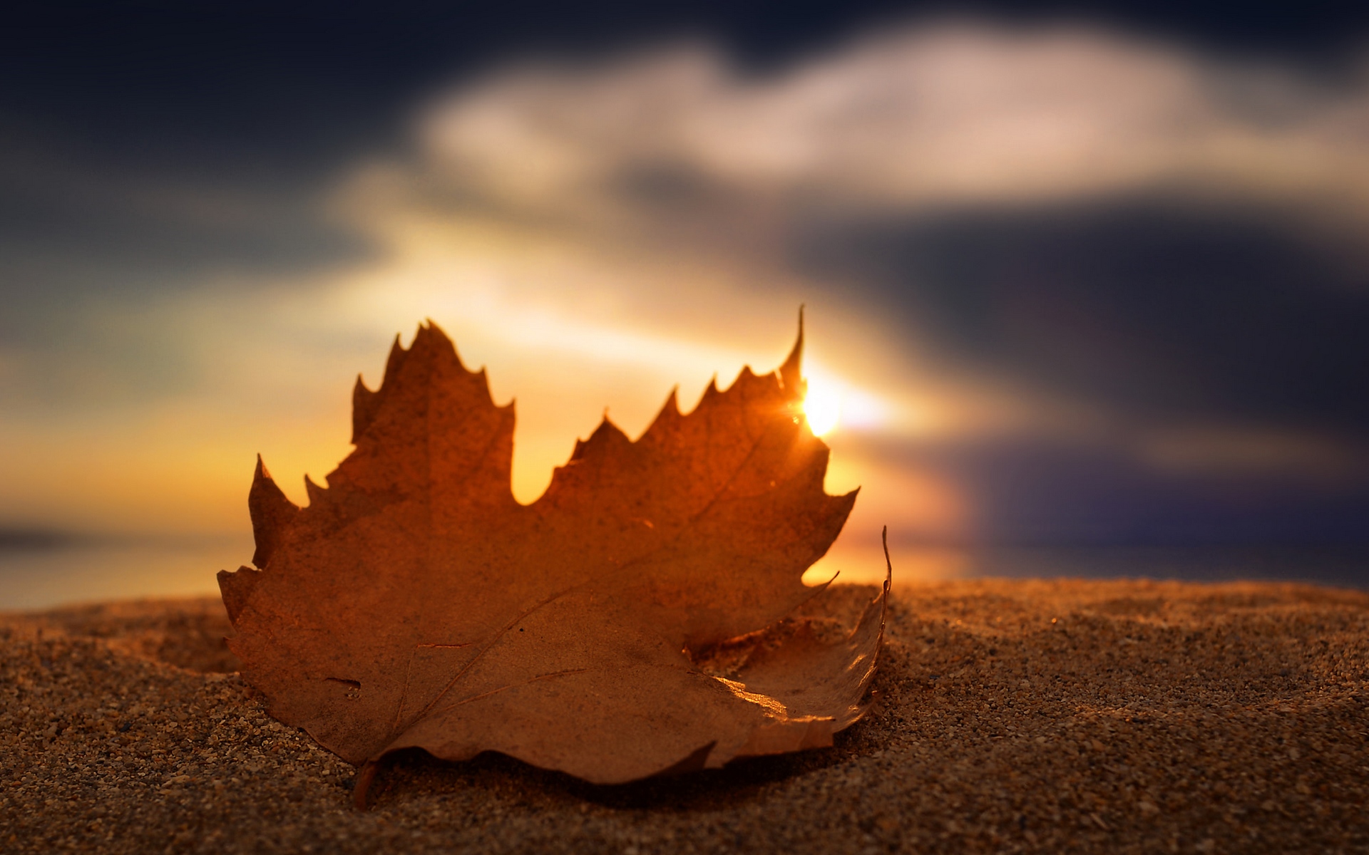Description: A leaf is laying on the sand at sunset or dawn.