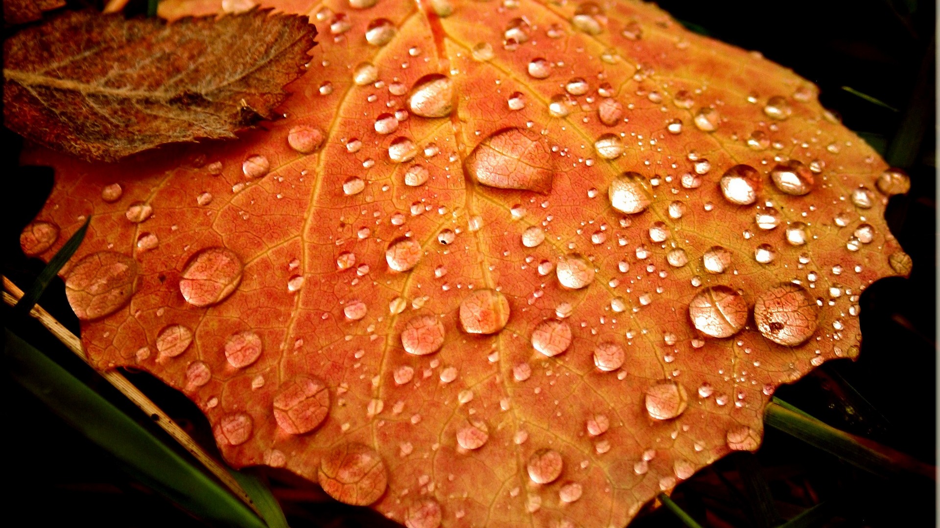 Description: A leaf with water droplets on it sitting on the ground next to grass and leaves with leaves on them.