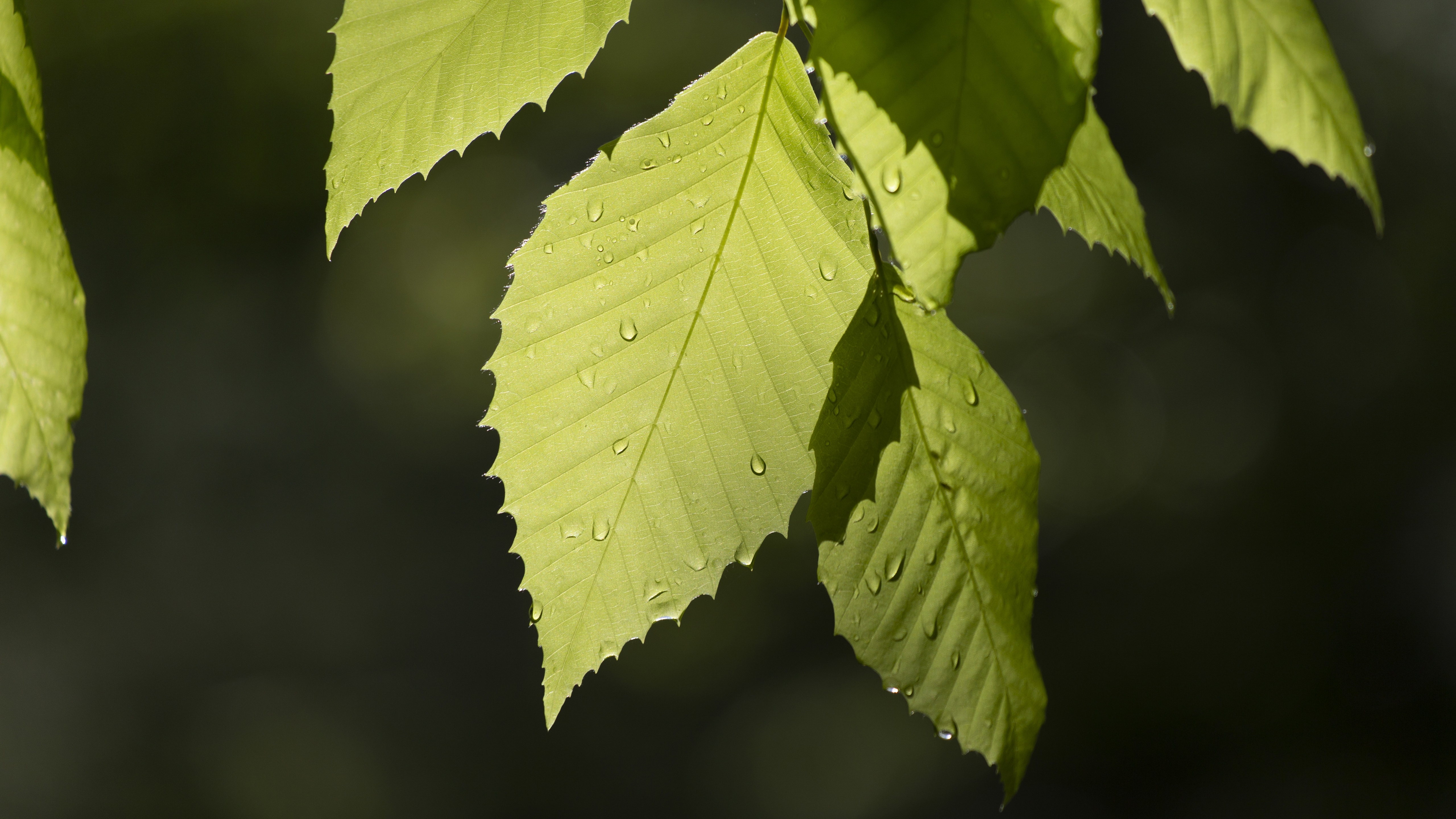 Description: A close up of a leaf with drops of water on it's leaves and a blurry background.