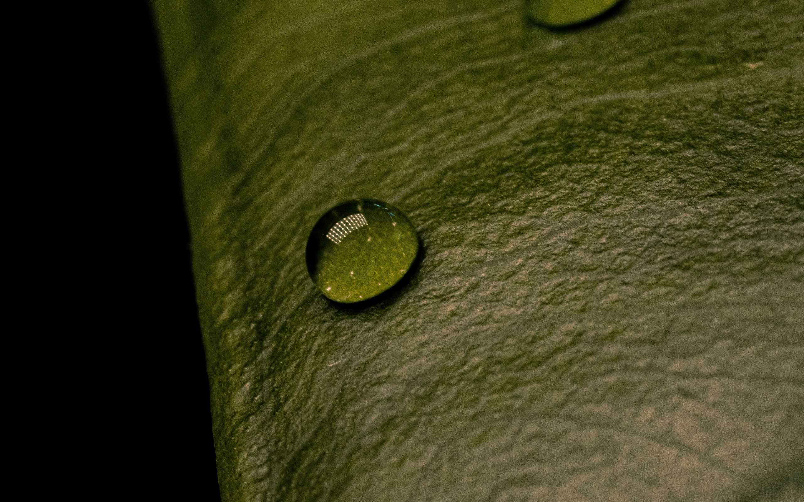 Description: A close up of a leaf with water drops on it's surface and a black background with a white spot.