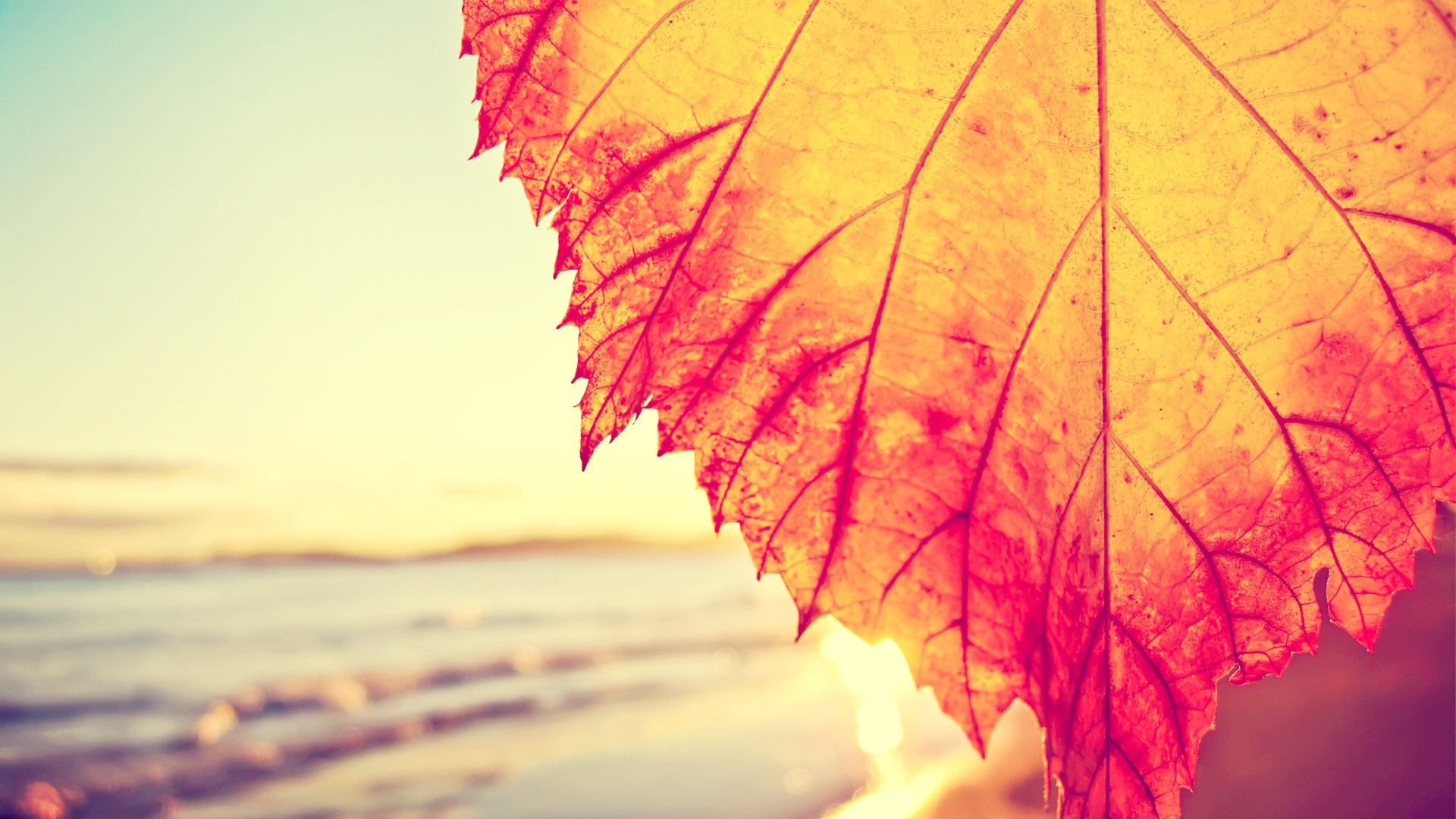 Description: A leaf is hanging from a tree near the water's edge at sunset or sunrise time.