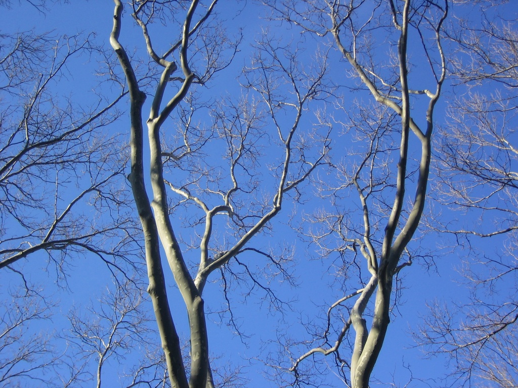Description: A tree with no leaves and a blue sky in the background with no clouds in the sky.