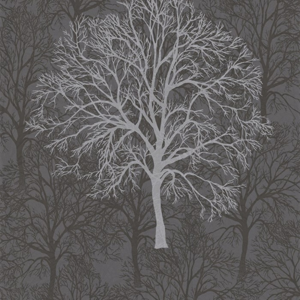 Description: A tree with no leaves on it in a forest with gray background and a white outline of a tree.