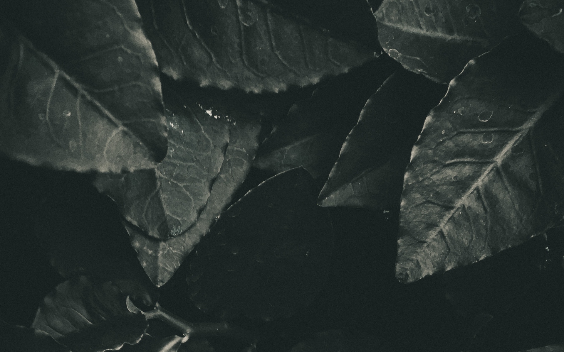 Description: A black and white photo of a leafy plant with drops of water on it's leaves and leaves.