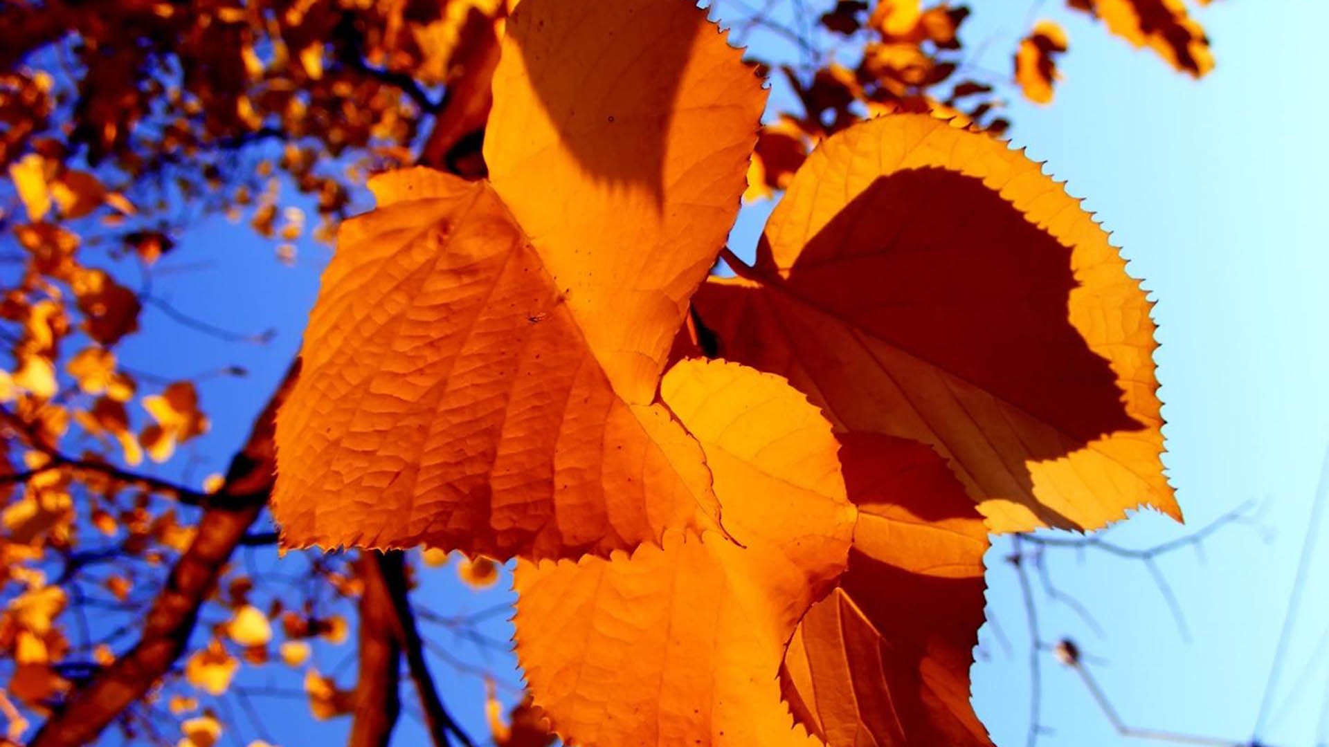 Description: A close up of a leafy tree with a blue sky in the background and a few leaves on it.