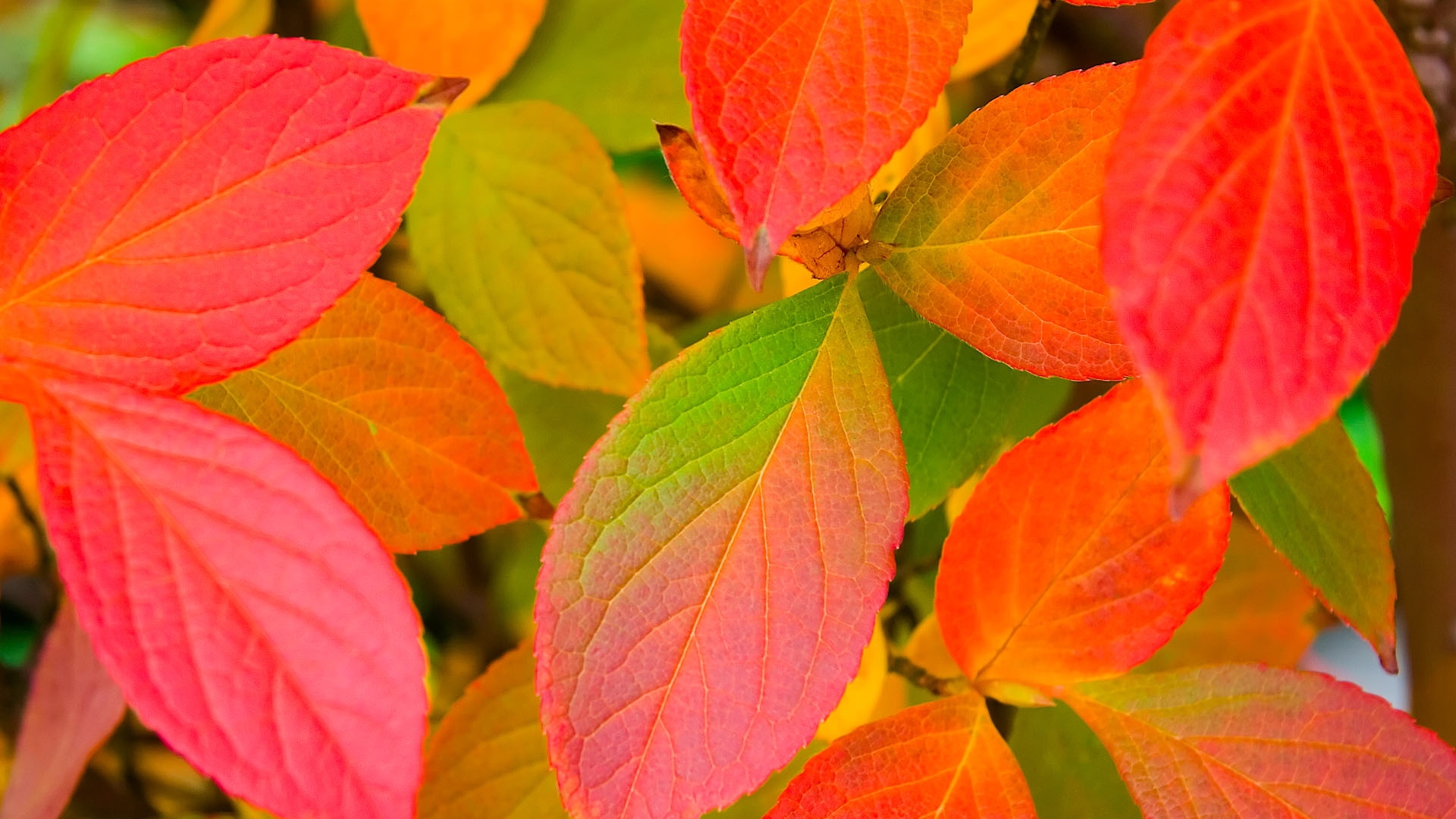 Description: A close up of a bunch of leaves on a tree branch with bright colors in the background and a blurry background.