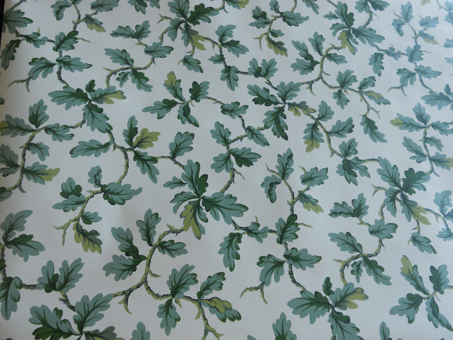 Description: A close up of a wallpaper with leaves on it and a clock on the wall behind it.
