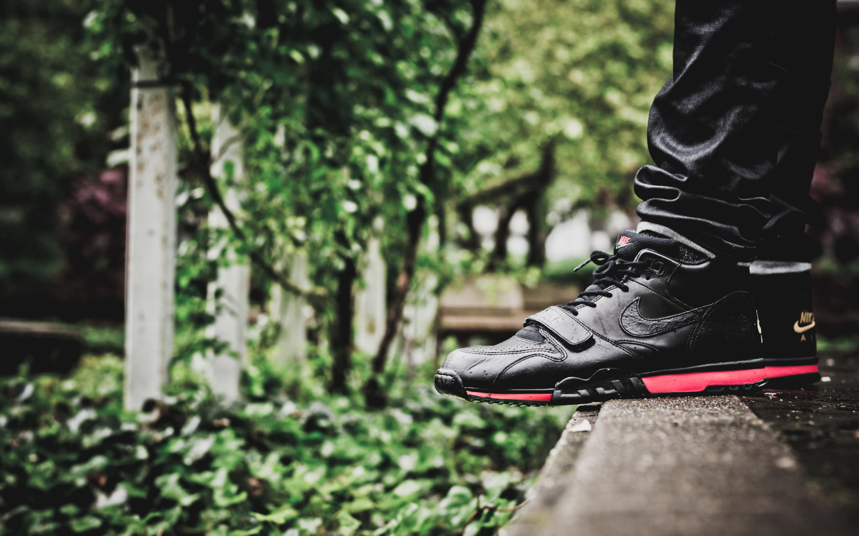 Description: A person standing on a ledge with their foot on a skateboard in the park.