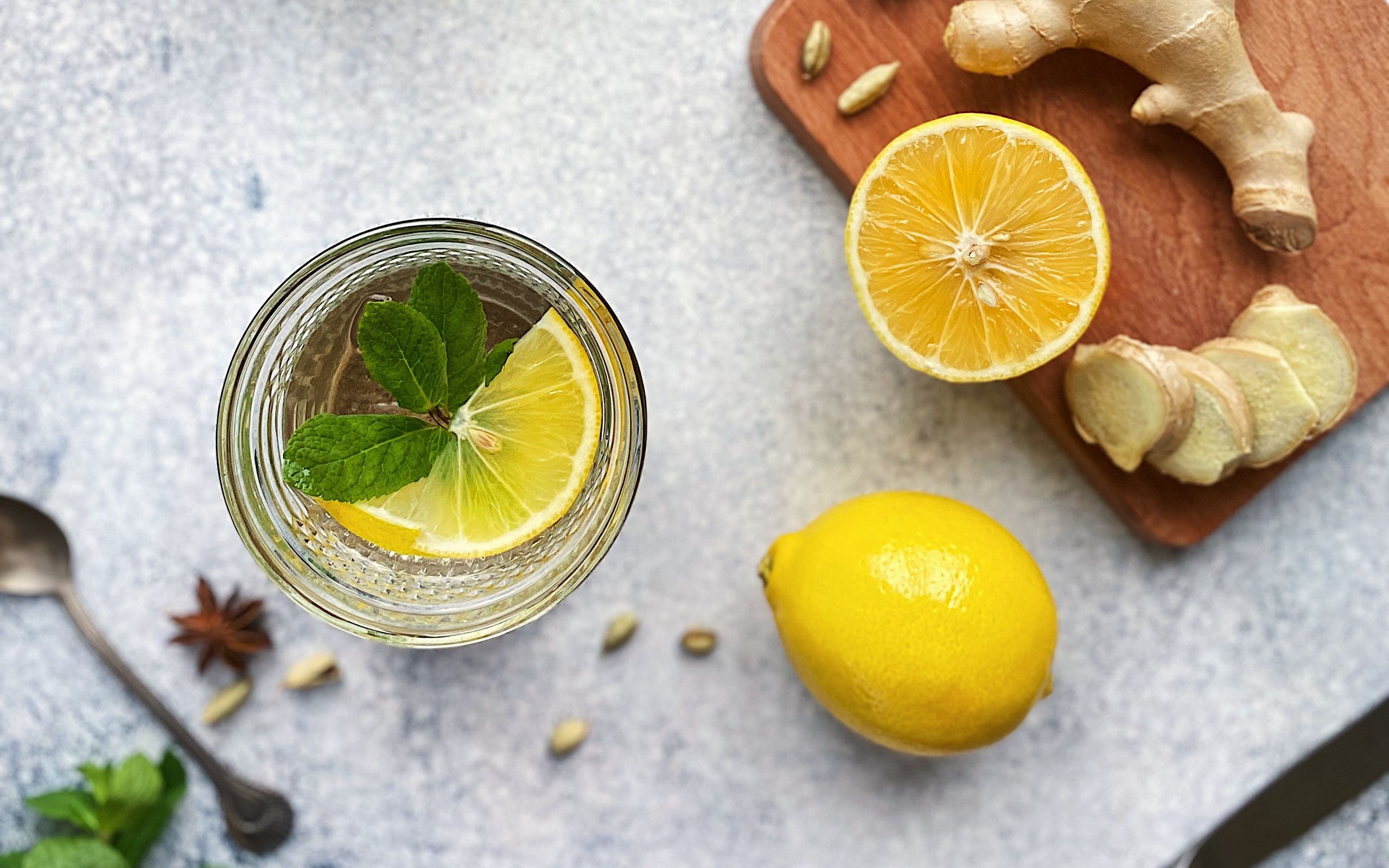 Description: A glass of lemon water with a lemon and ginger on a cutting board next to it and a spoon.