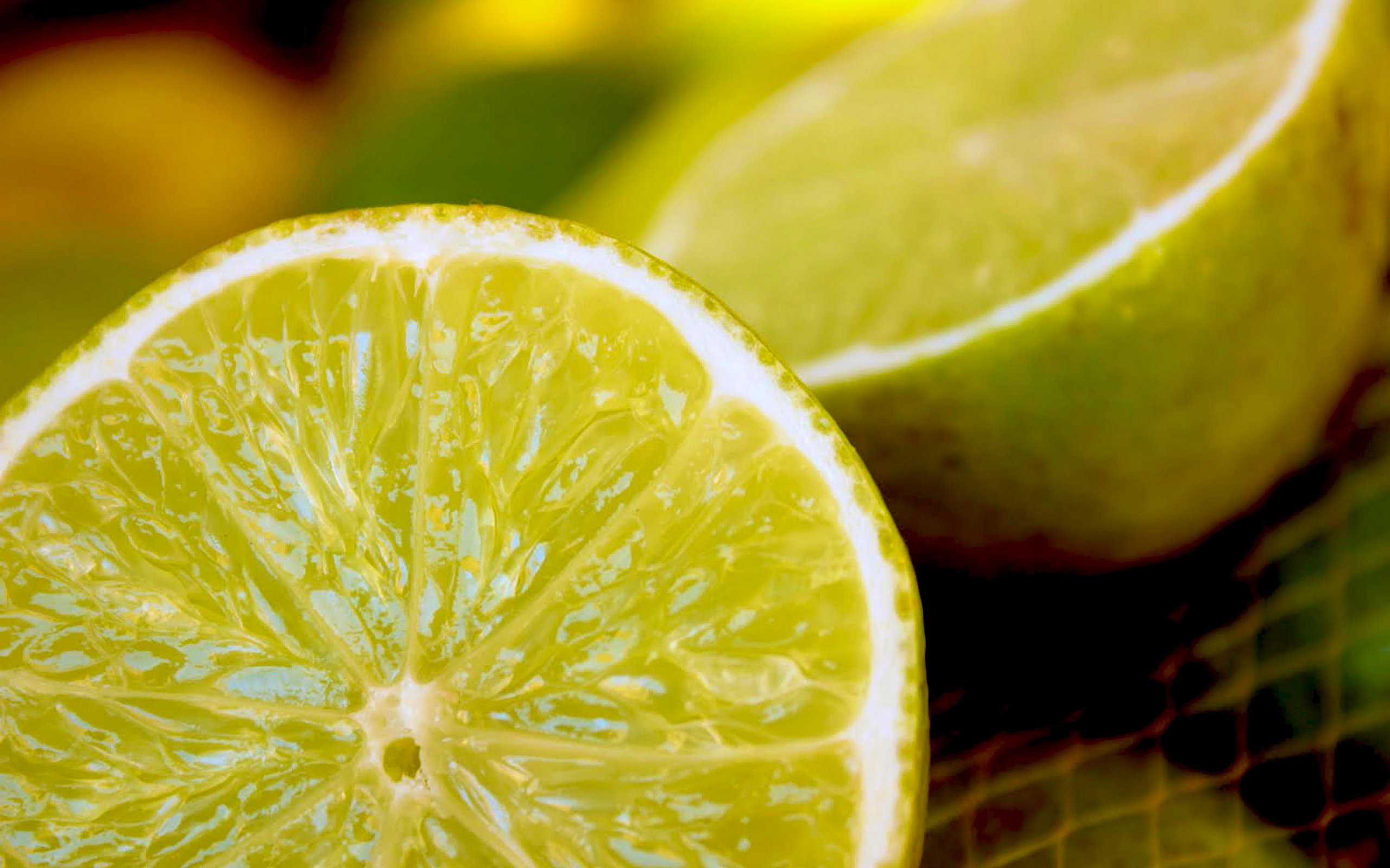 Description: A close up of a lemon and a lime on a table top with other lemons in the background.