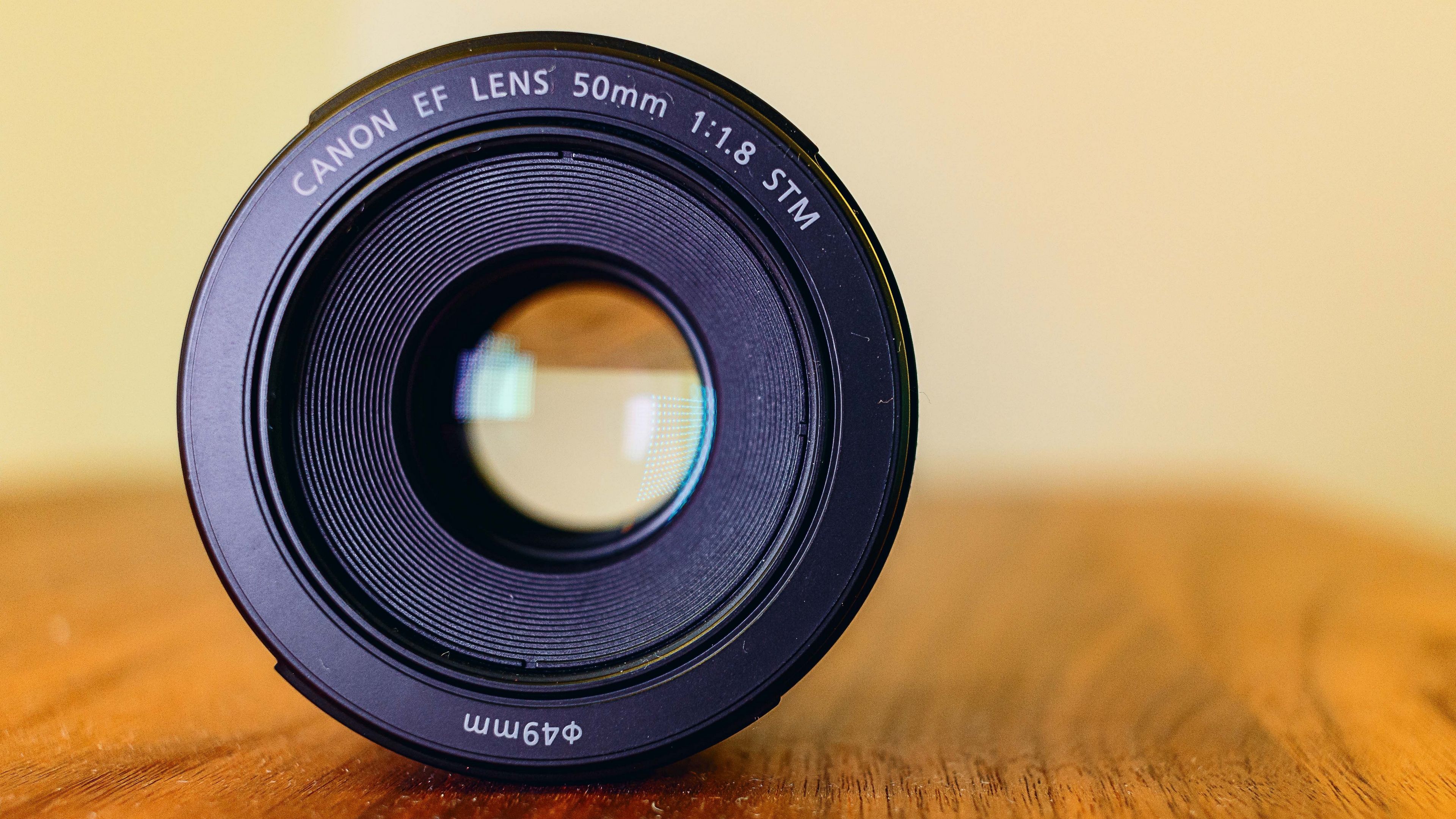 Description: A lens sitting on top of a wooden table with a lens attached to it's body and a lens cap on top of it.