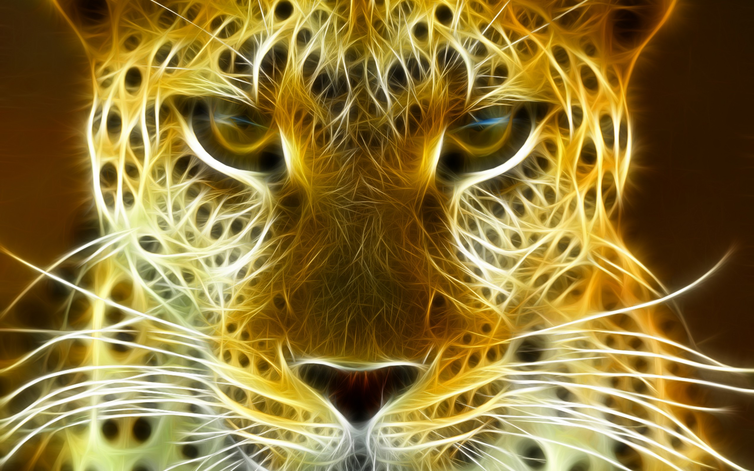 Description: A digital painting of a leopard's face with blue eyes and yellow fur on it's head.