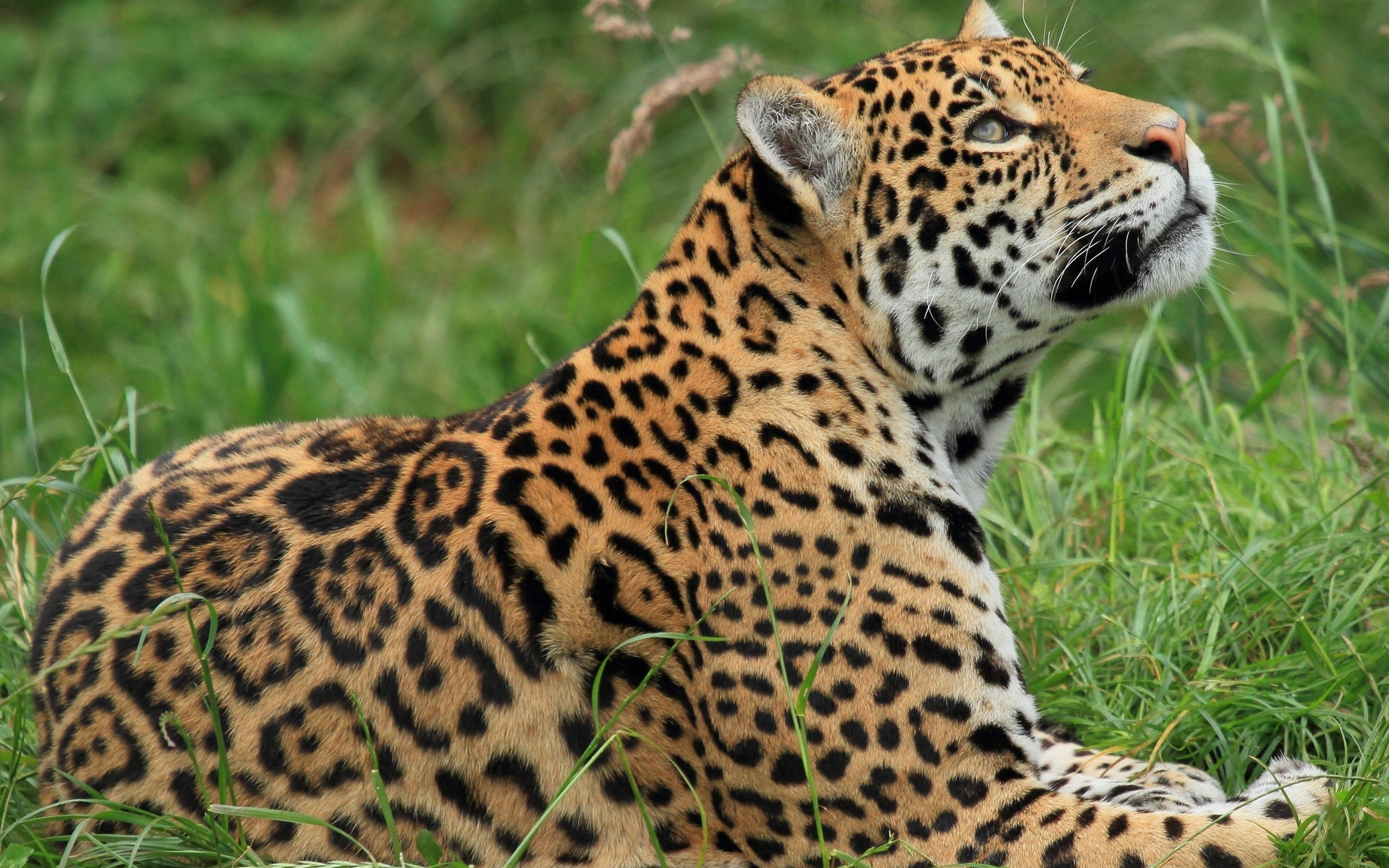 Description: A leopard laying in the grass looking up at something in the distance with its eyes closed and mouth open.