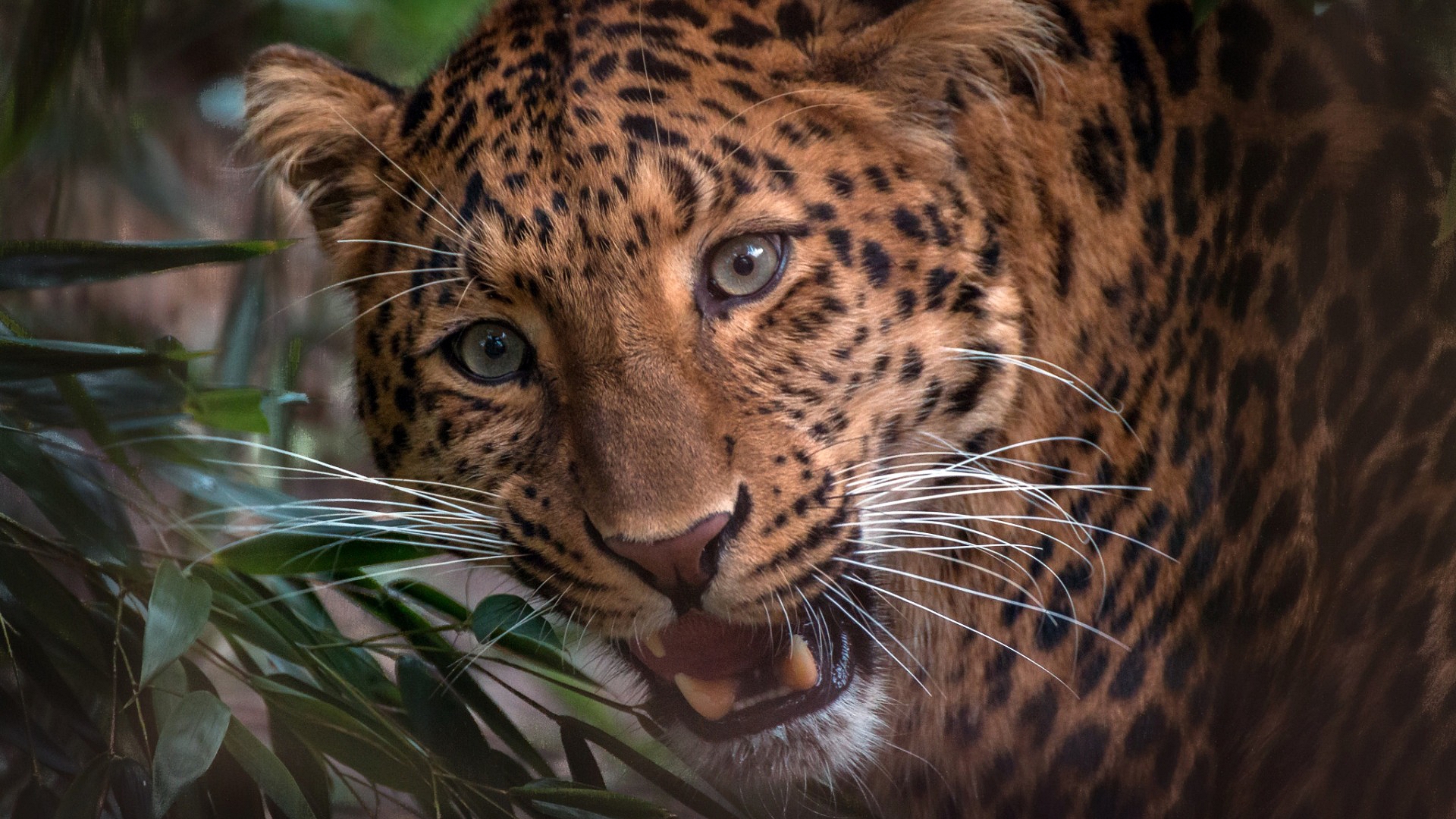 Description: A close up of a leopard with its mouth open and a plant in the foreground with its mouth open.