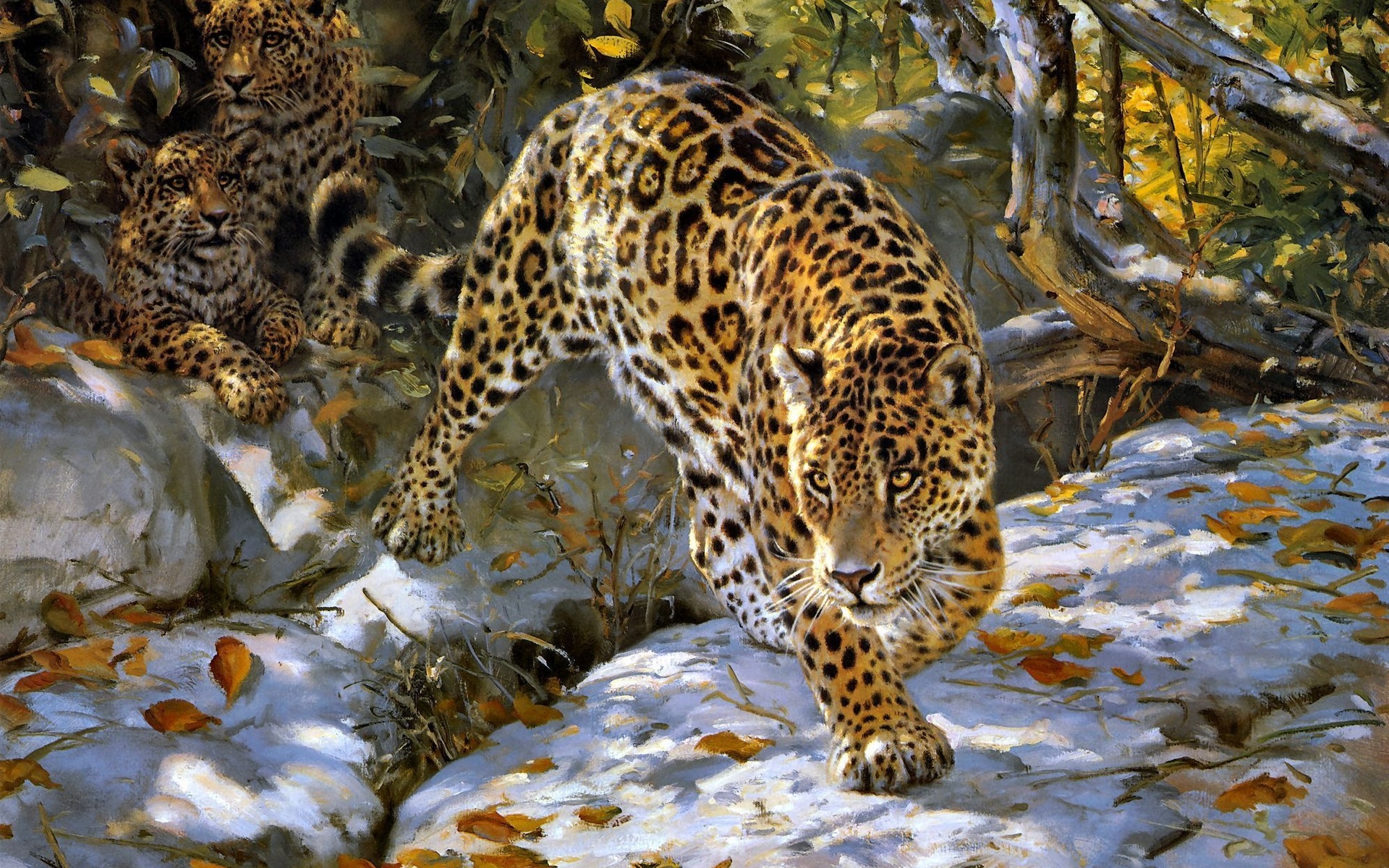 Description: A painting of a leopard walking on a snowy surface with trees in the background and leaves on the ground.