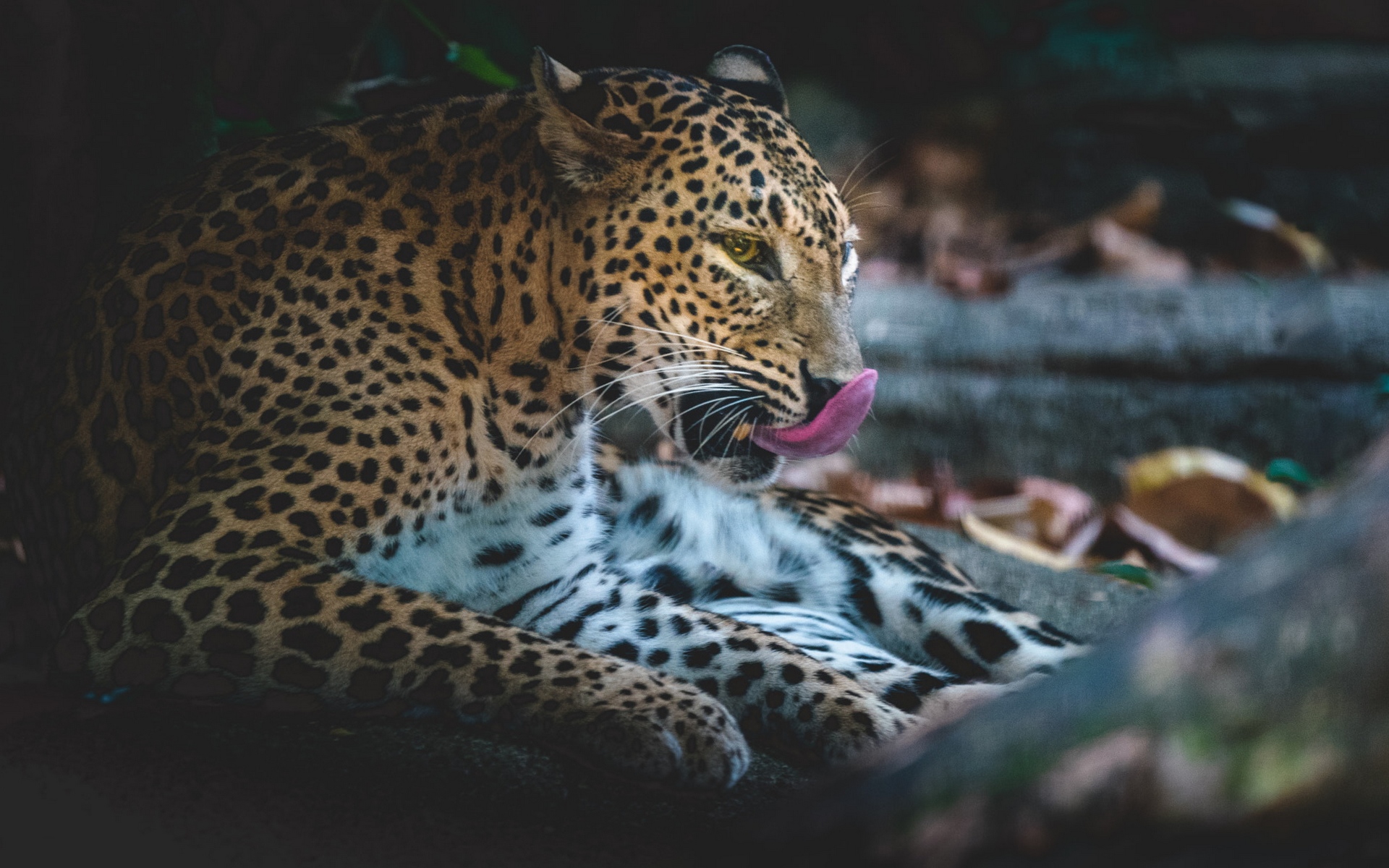 Description: A leopard with its tongue out sitting on the ground in the shade of a tree trunk and looking at the camera.