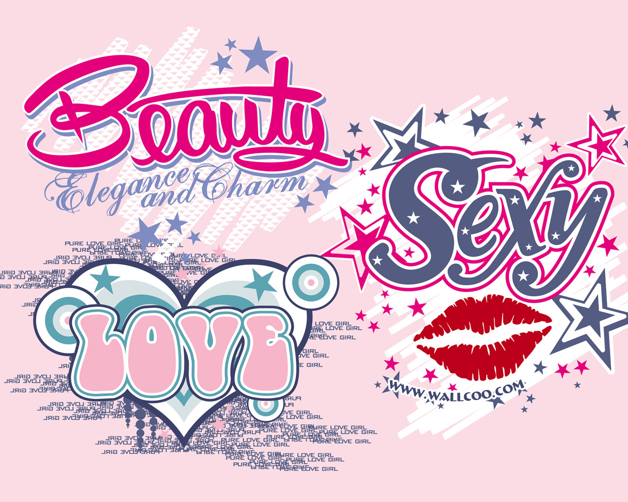 Description: A couple of different type of lettering on a pink background with stars and a kiss on the lips of each other.