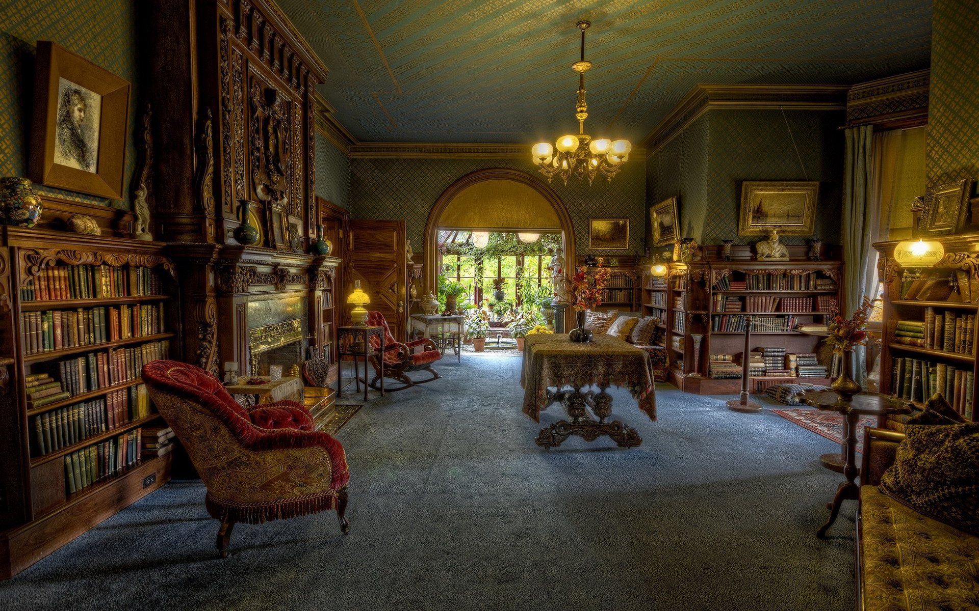 Description: A room with a lot of books and a couch and chair in it and a chandelier hanging from the ceiling.