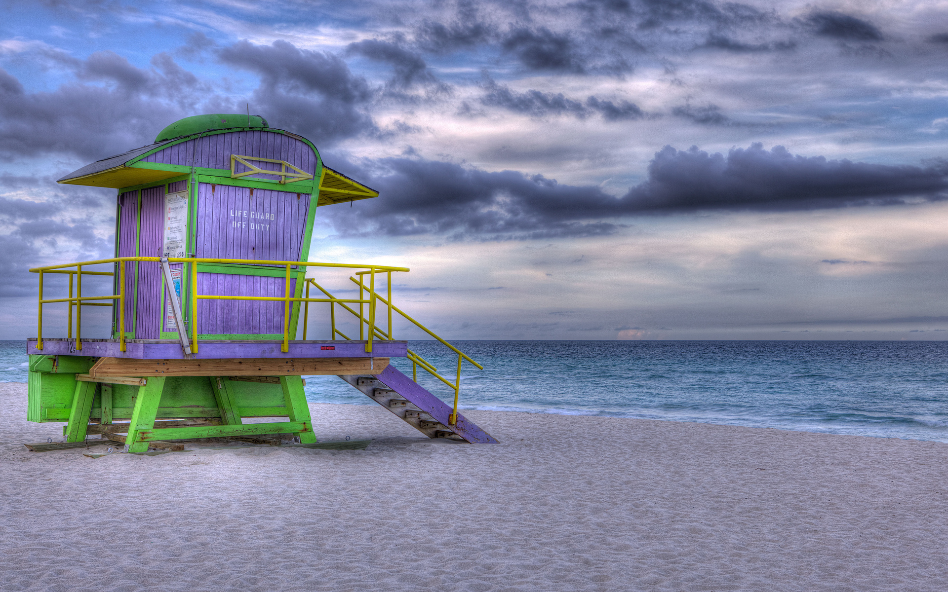 Description: A lifeguard tower on a beach with a ladder leading to it and a cloudy sky above it.