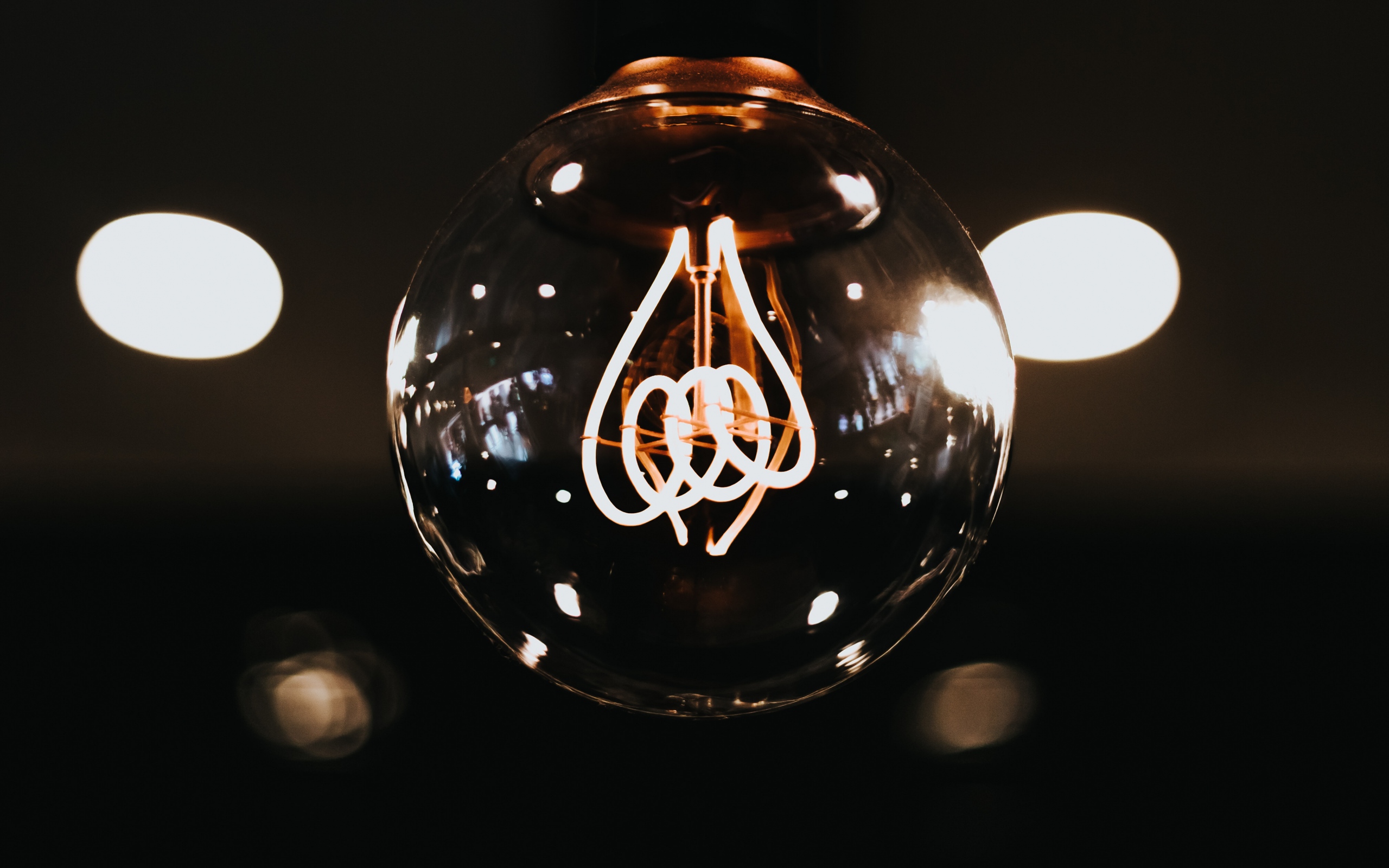 Description: A light bulb with a string in it on a table with lights in the background and a black background.