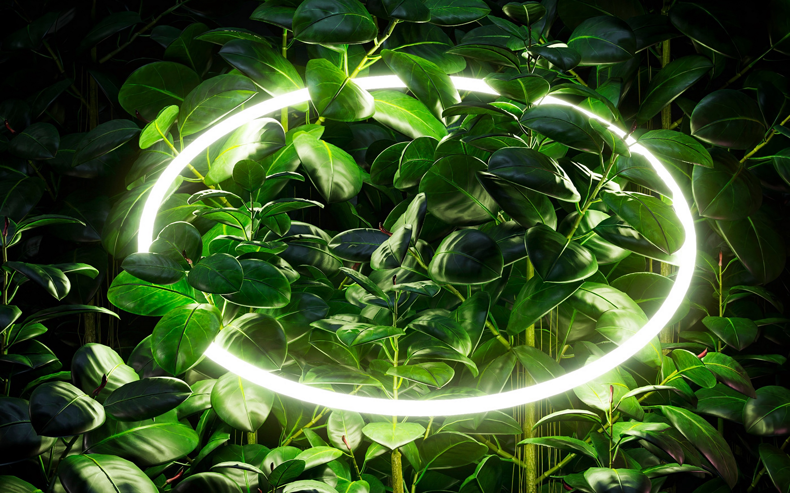 Description: A circle of light surrounded by green leaves and plants in the dark night time.