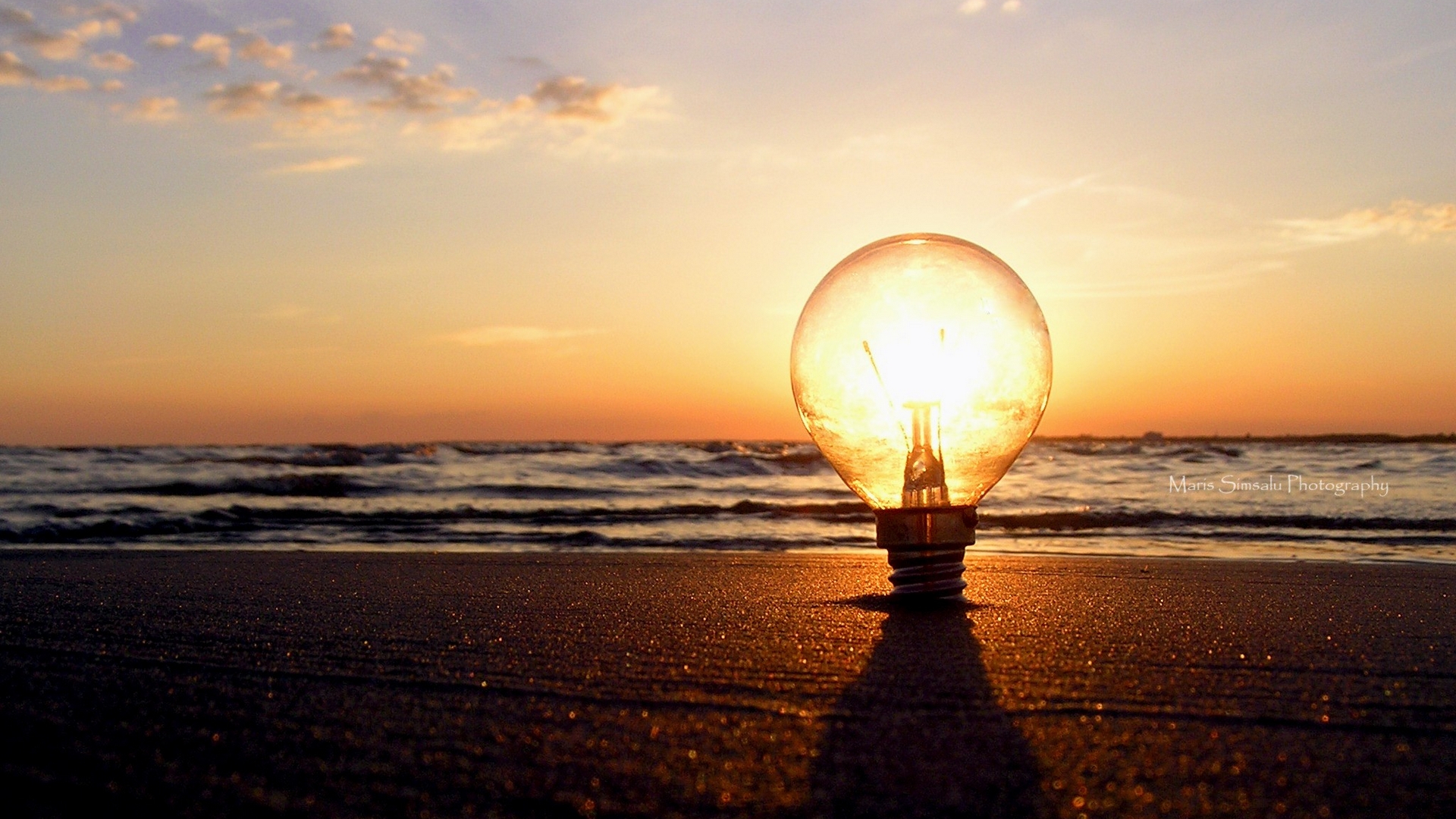 Description: A light bulb sitting on top of a sandy beach next to the ocean at sunset or dawn with a person standing on the beach.