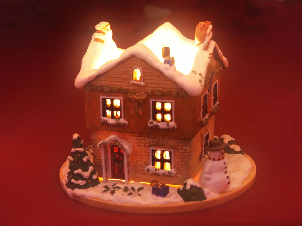 Description: A lighted house with snow on the roof and windows and a chimney on top of it with a snowman on top.