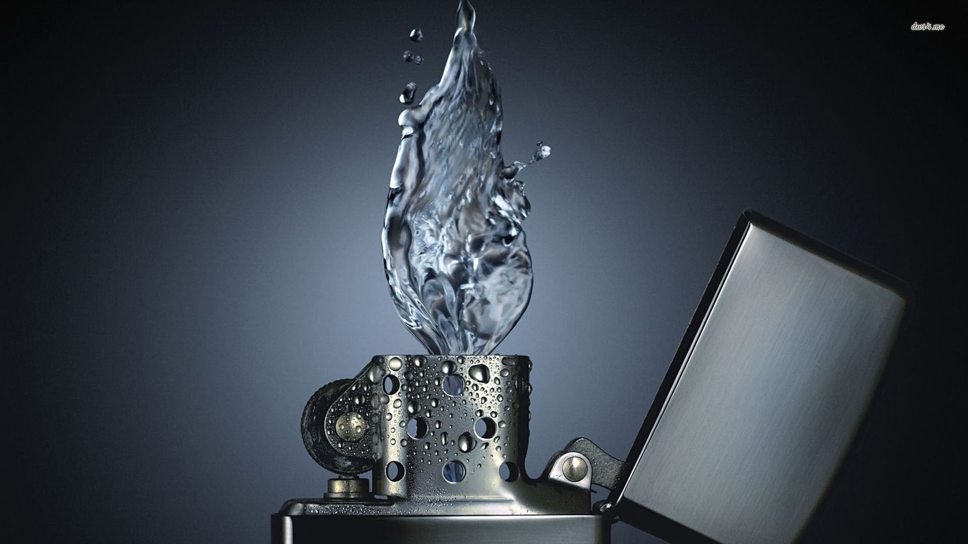 Description: A lighter with water splashing out of it's top and a lighter lighter in the background with a black background.
