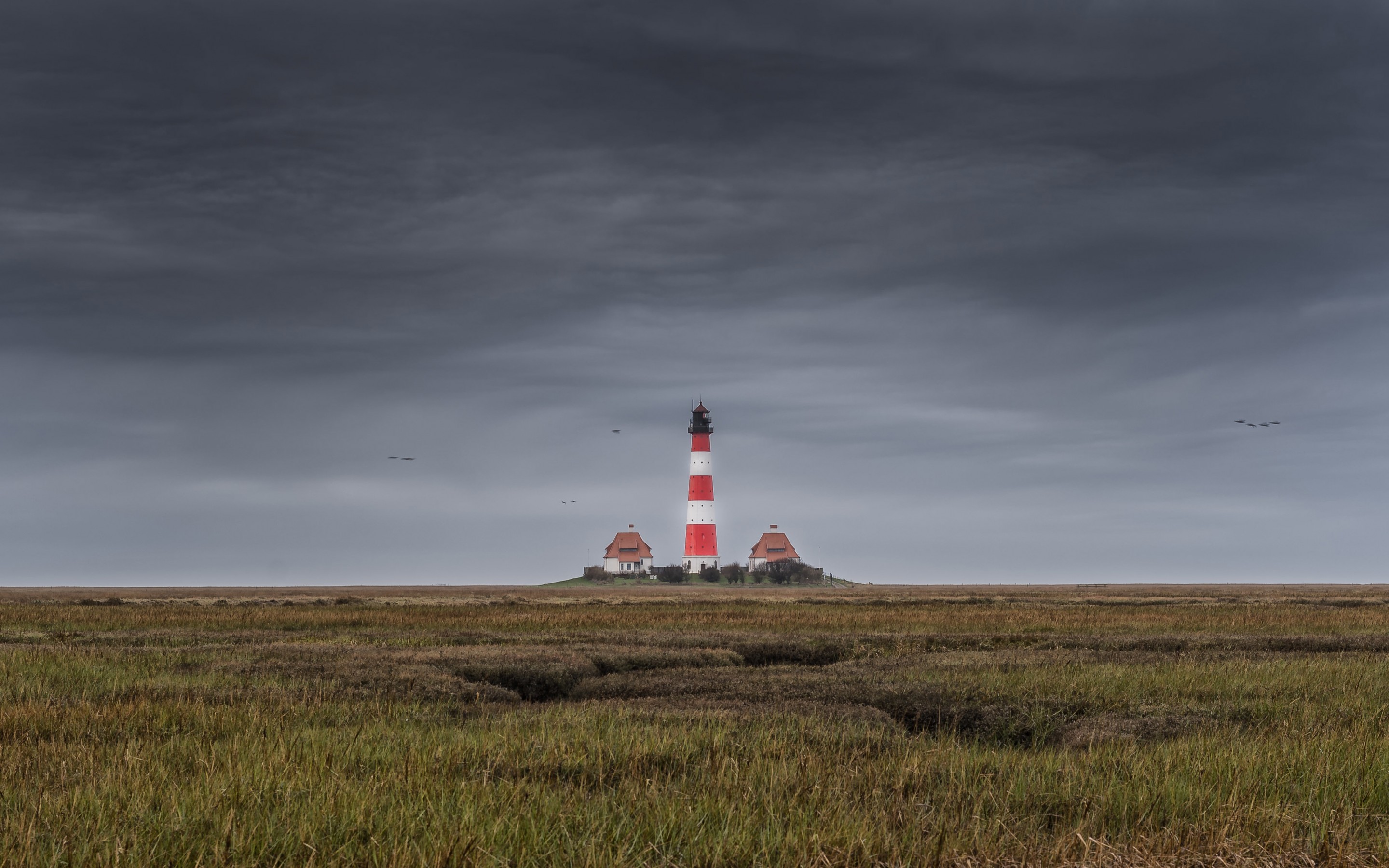 Description: A lighthouse on a grassy island under a cloudy sky with birds flying overhead in the distance.