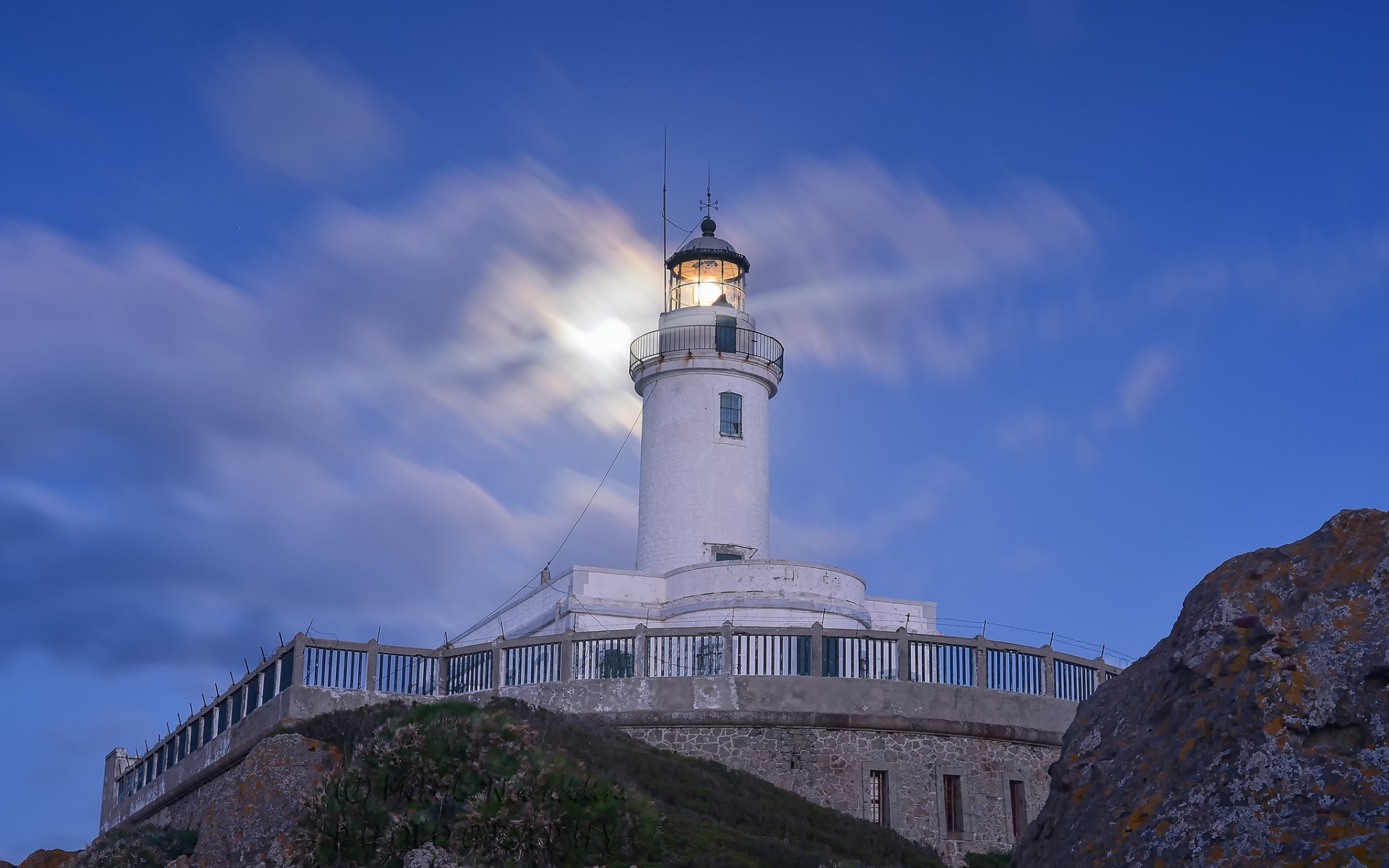 Description: A lighthouse on a hill with a full moon in the background and clouds in the sky above it.