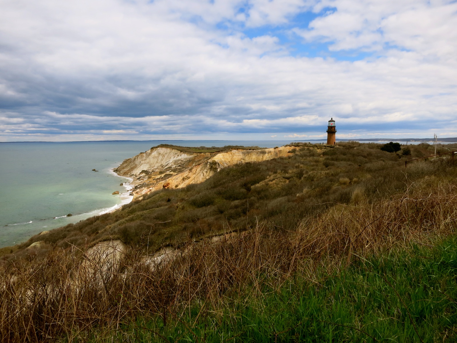 Description: A lighthouse on a hill overlooking the ocean and a cliff with a light house on top of it and a cloudy sky.