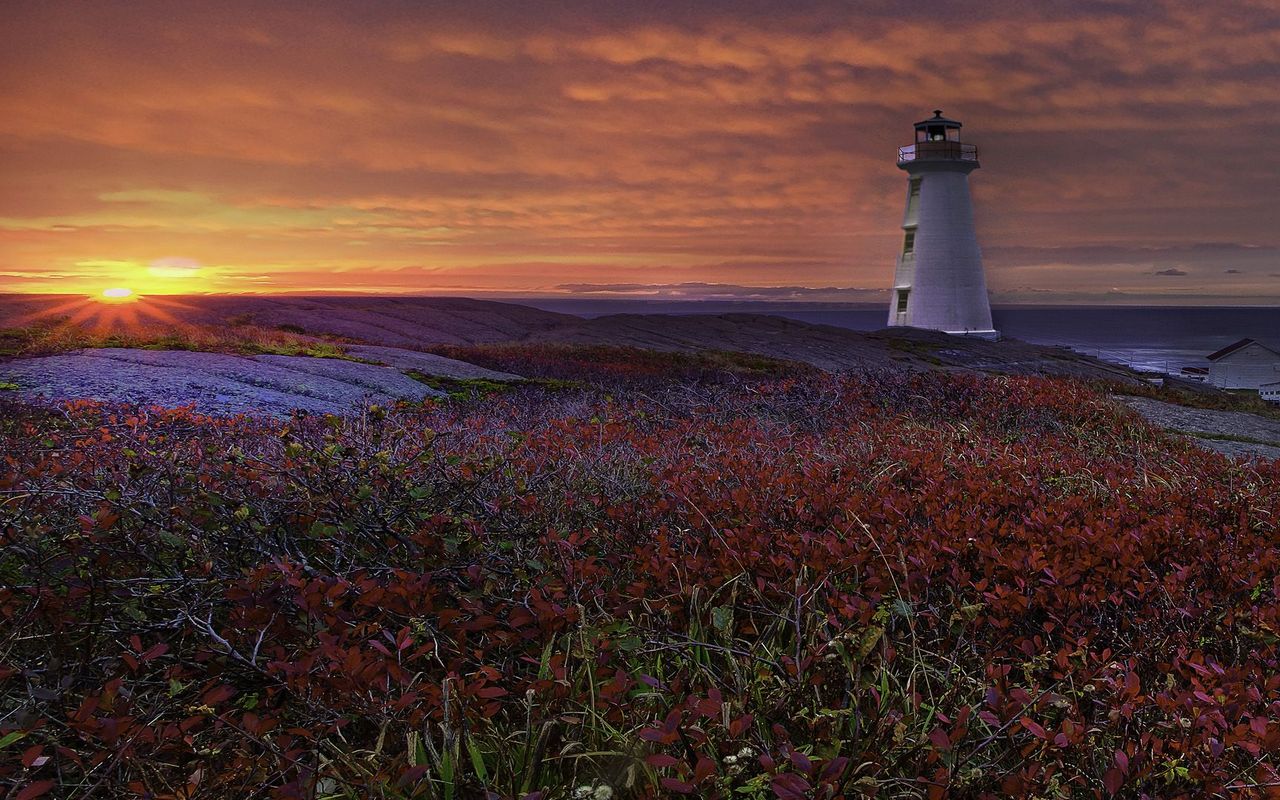 Description: A lighthouse on a hill with a sunset in the background and flowers in the foreground.