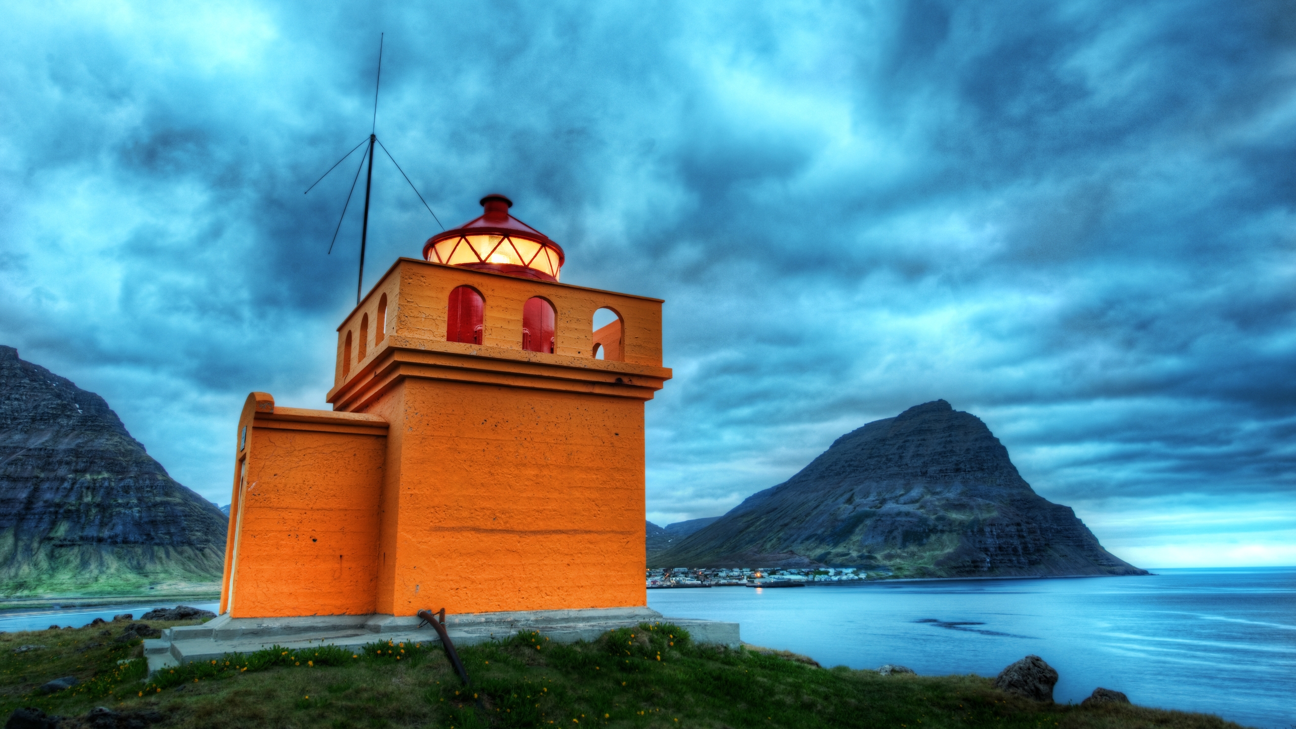 Description: A lighthouse on a hill overlooking a body of water and mountains in the background with a cloudy sky above.